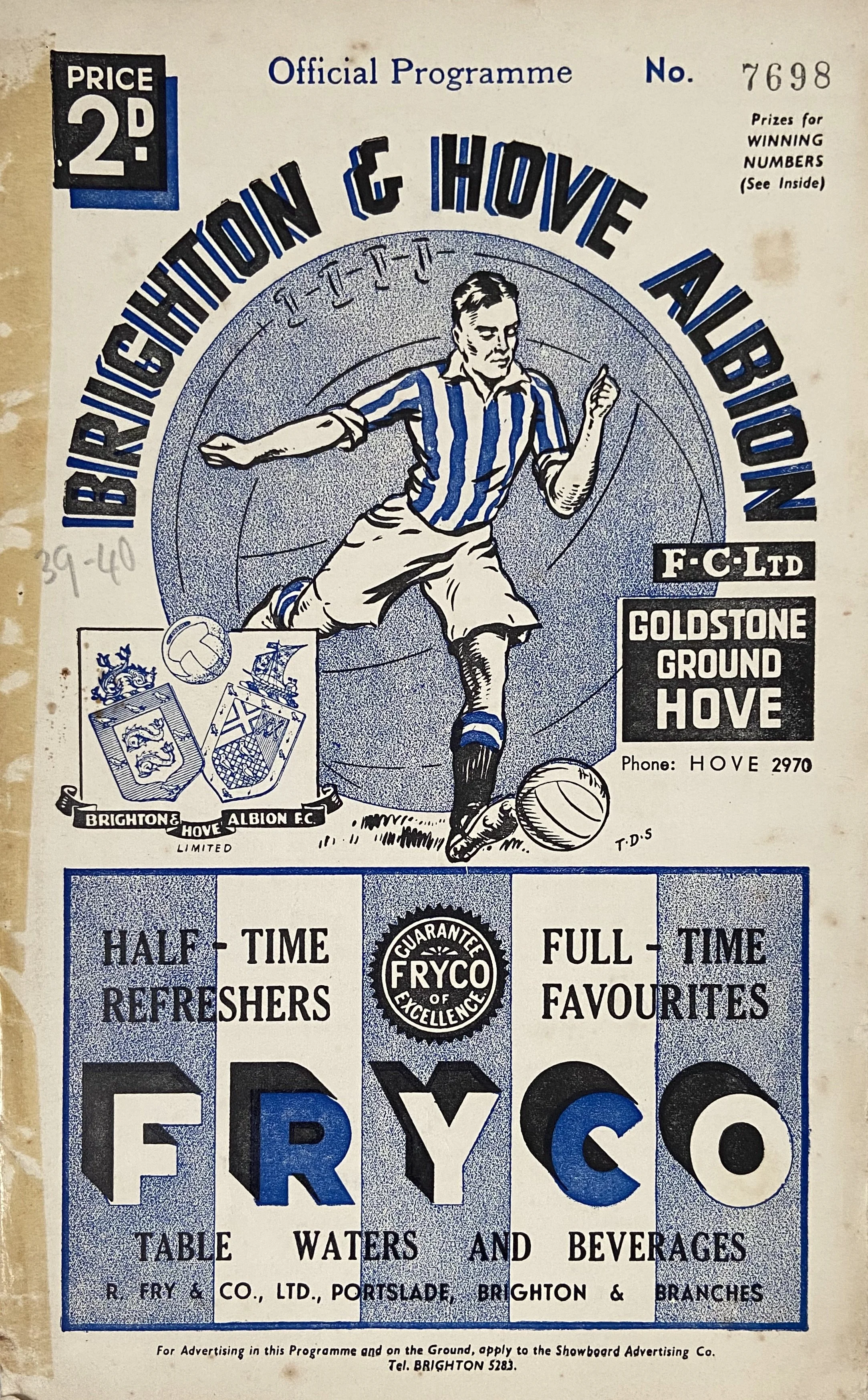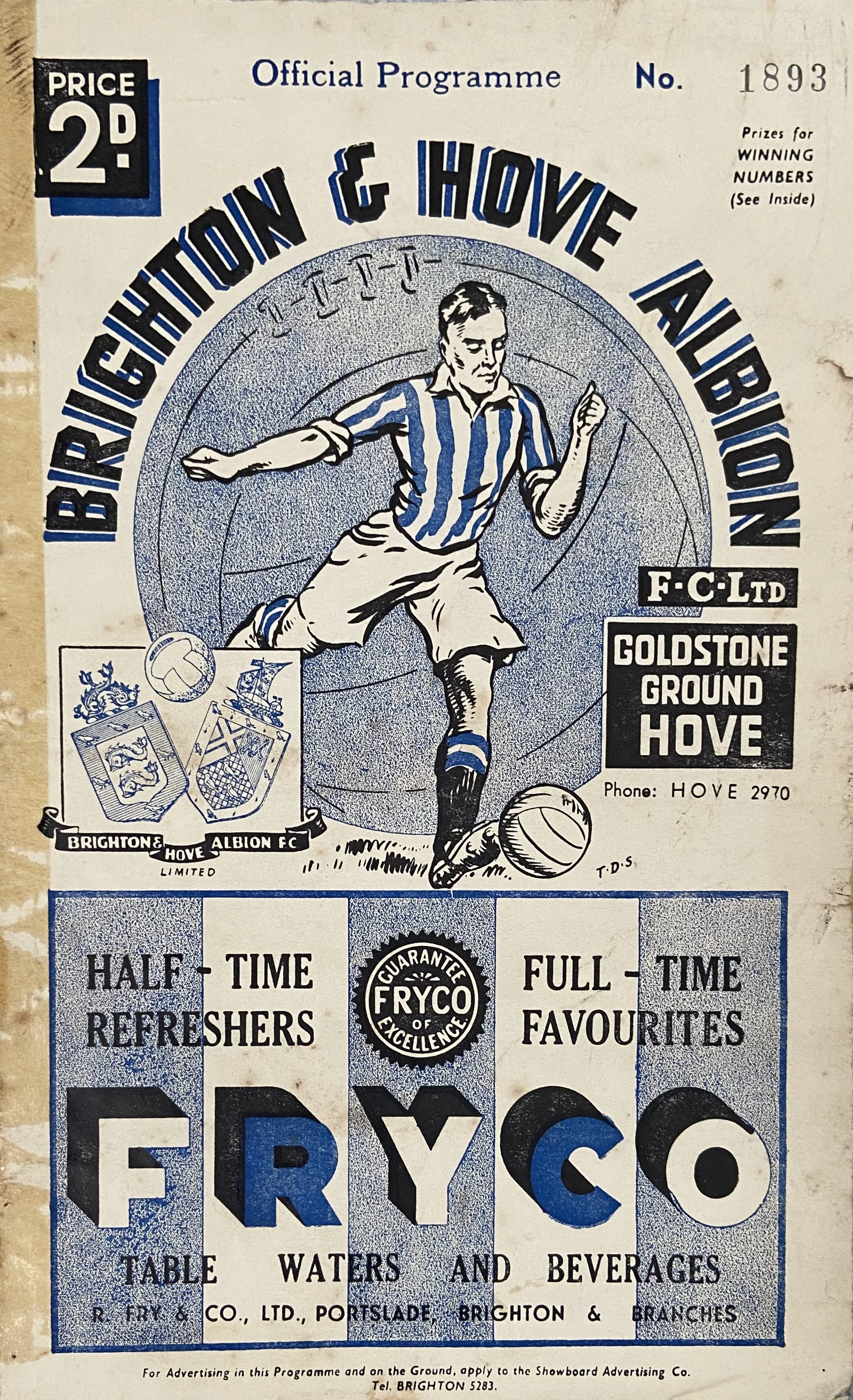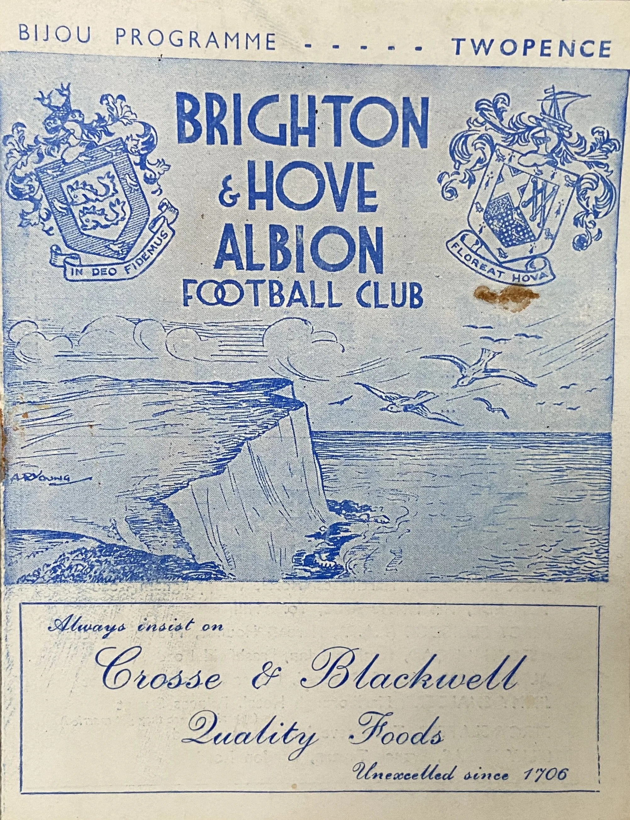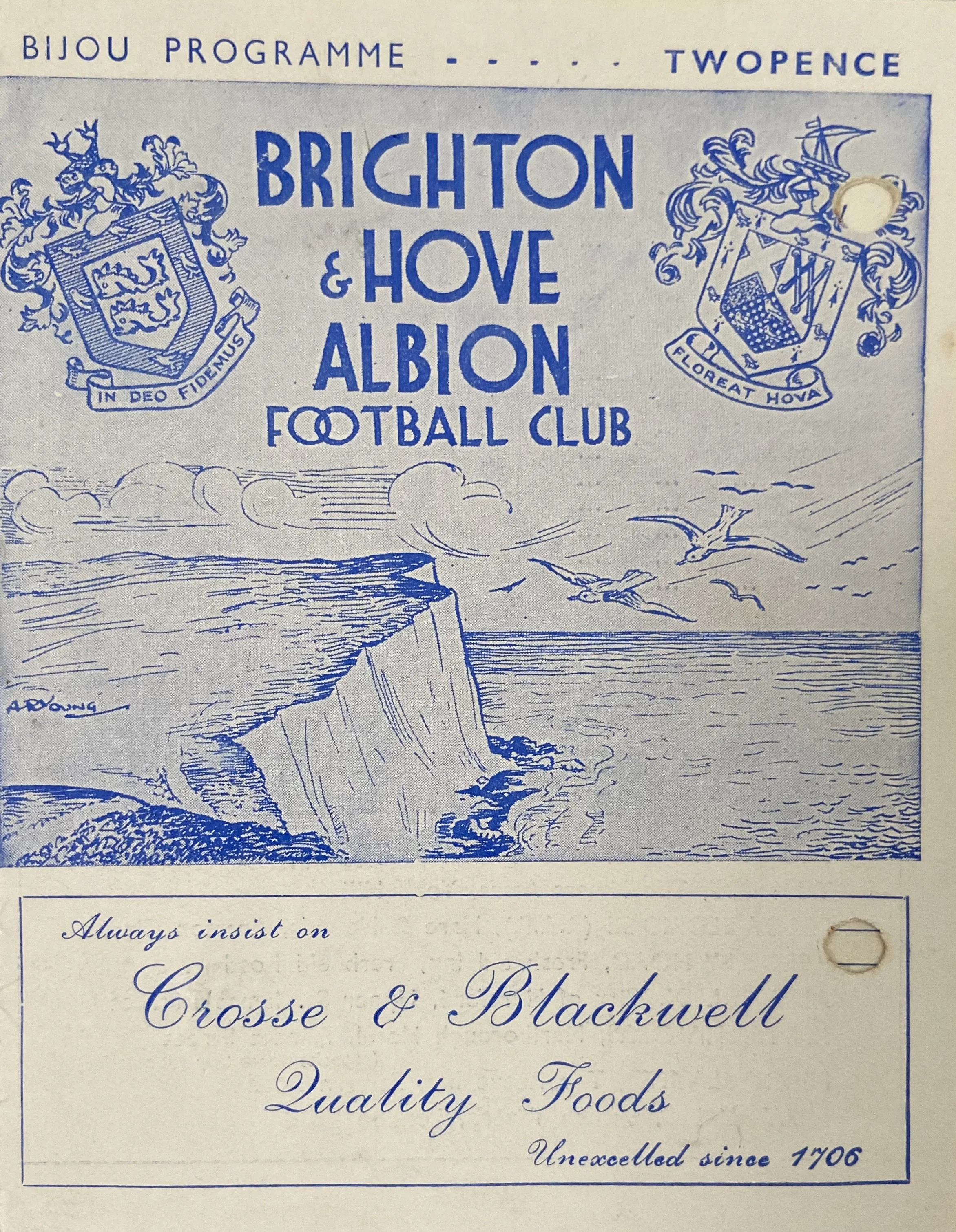 For obvious reasons, programmes from that time were either not produced, or did not survive, so any that do come to light, are extremely sought-after. Many images of the home programmes that follow, were provided by Albion fan Ken Stone, who has now sadly passed away. He saw his first game in November 1941 when Albion played some games at Lewes. I am so grateful to Ken’s wife Christine for sending these through to me. I am also grateful to Heritage Society members Dave Forshaw and Kev Beales, for some of the other images, as well as Mick Wright.