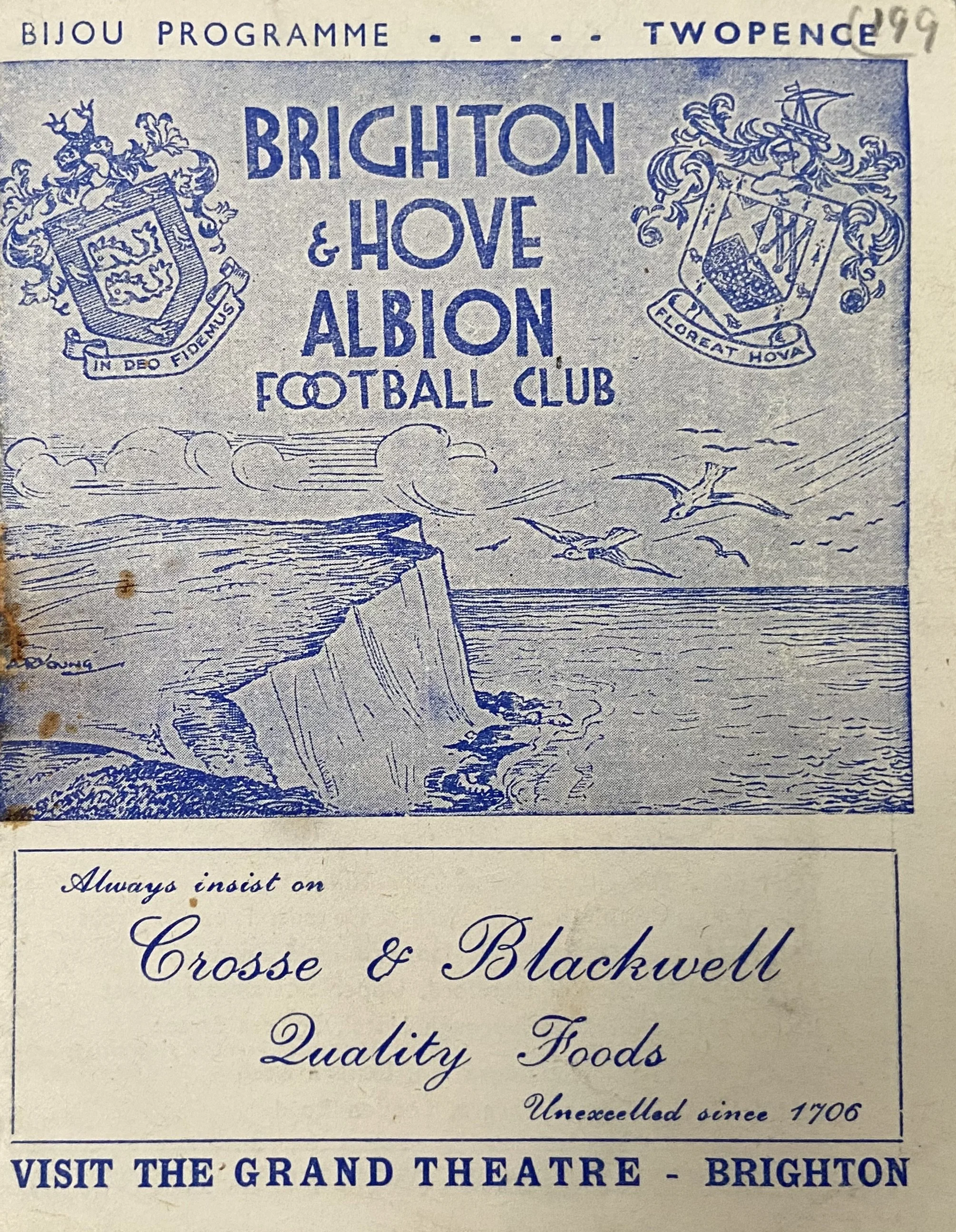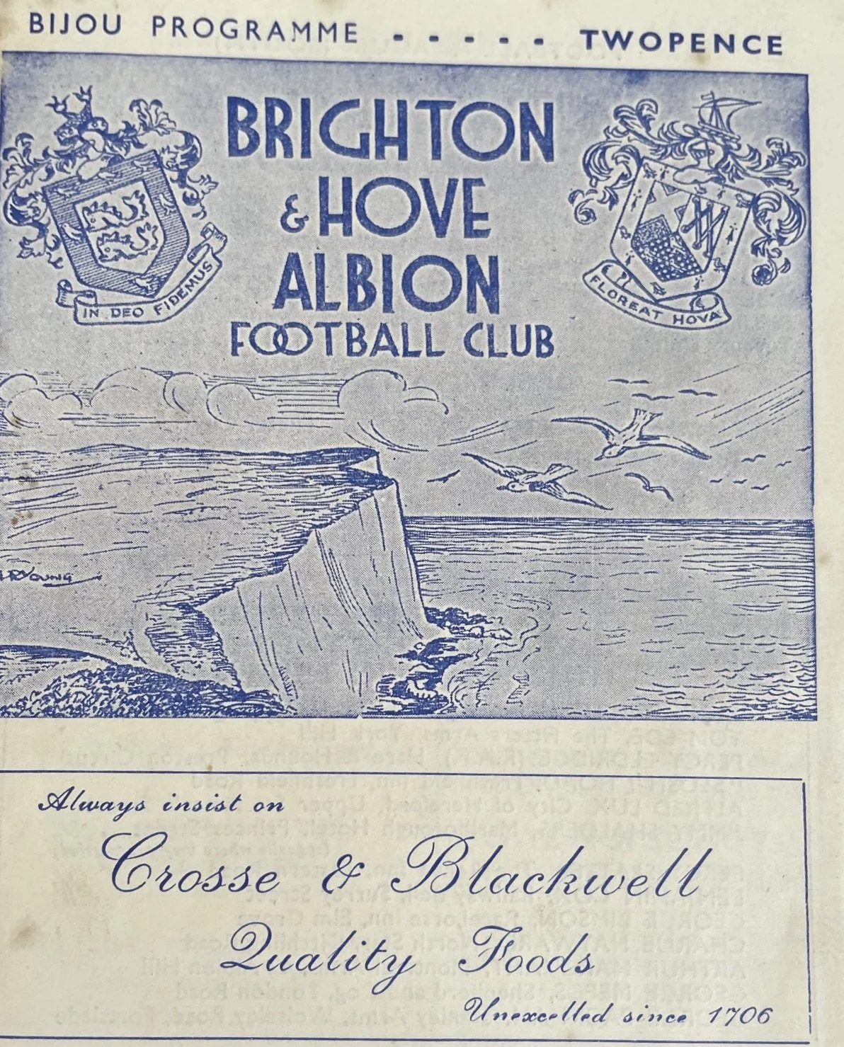 Following the end of WWII, it was decided that this would be an ‘interim season’, as the country came to terms with the return of peacetime. It was the same for the programme, which continued as it was during the war. The smaller ‘bijou’ design continued, with all programmes issued in an 8-page format, with the exception of the games against Walthamstow Avenue (see below) and Bournemouth & Boscombe Athletic. The cover price was 2d.