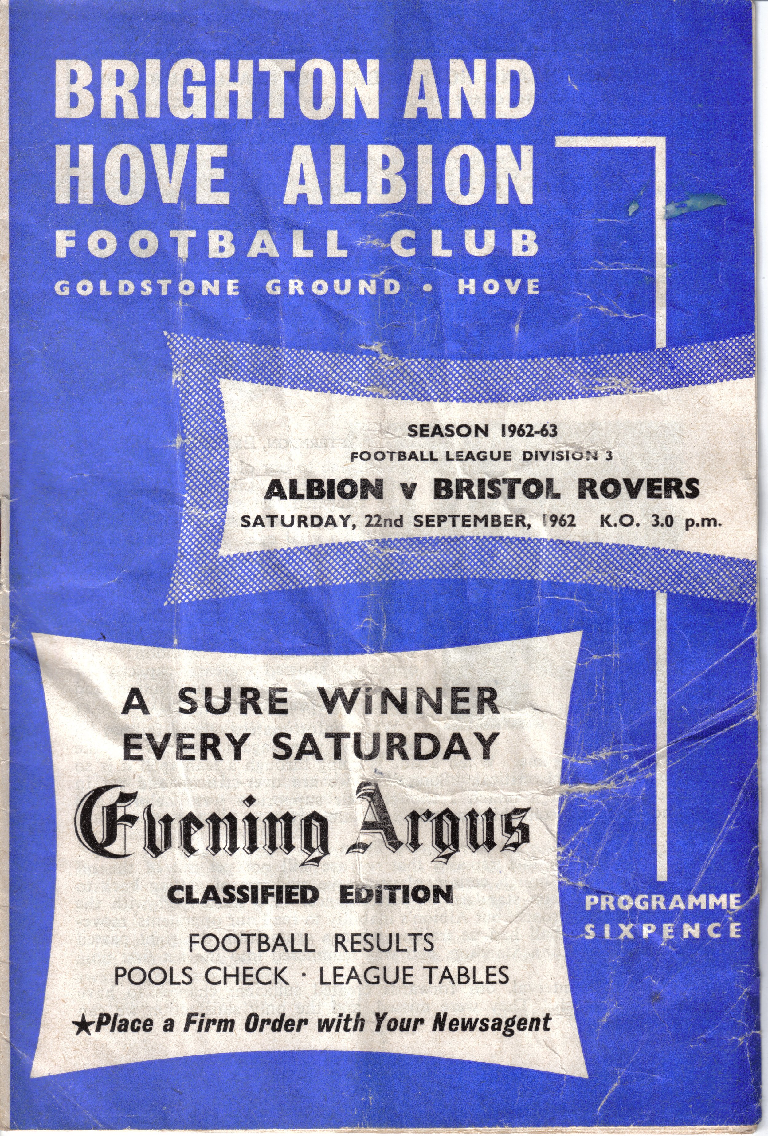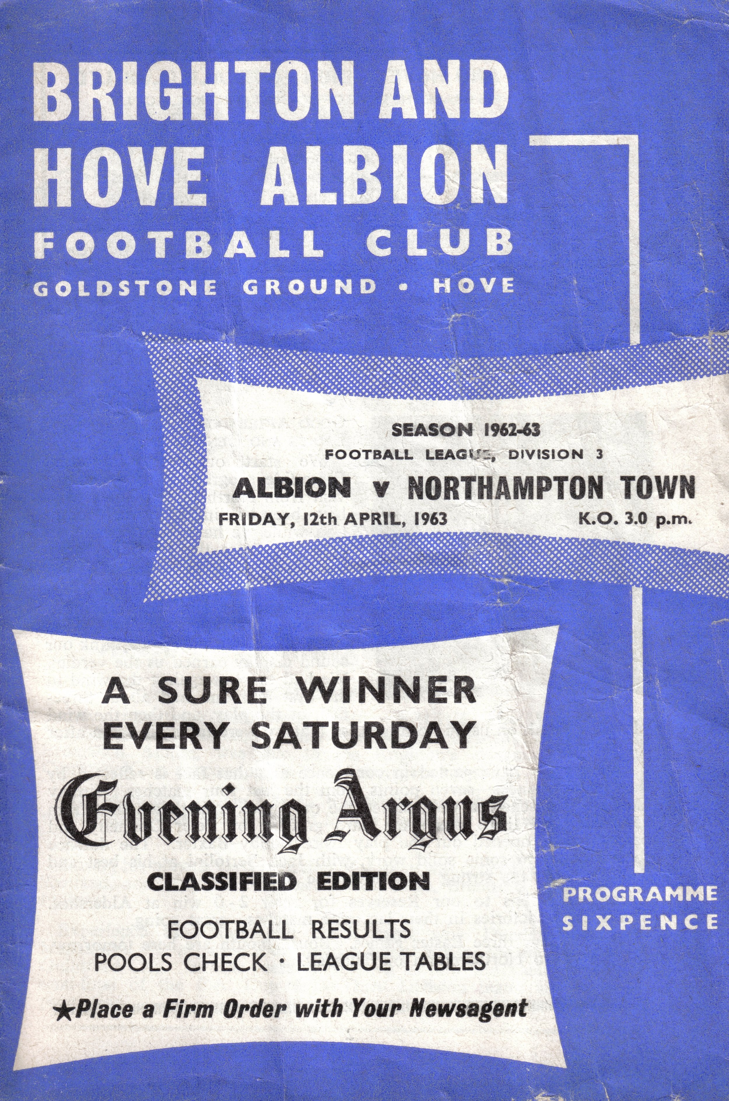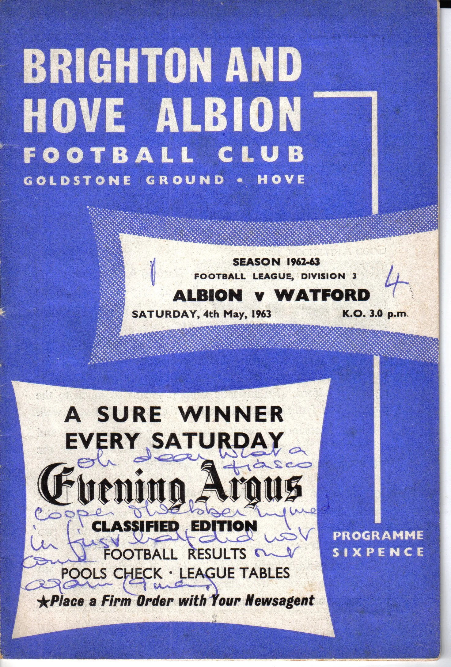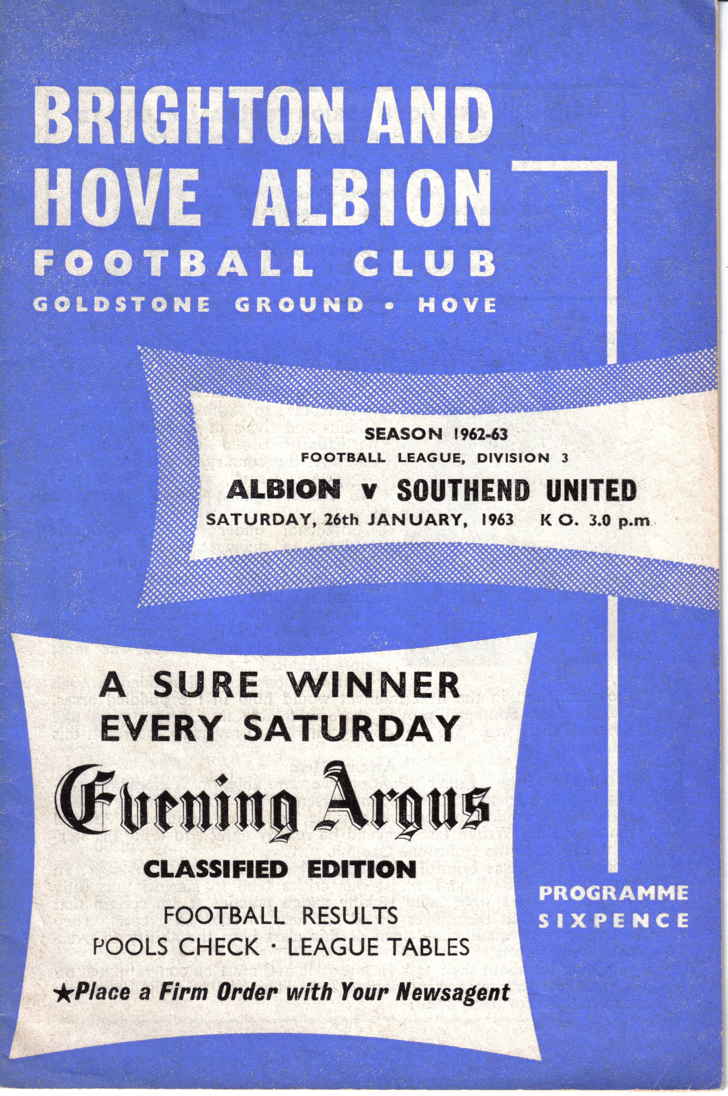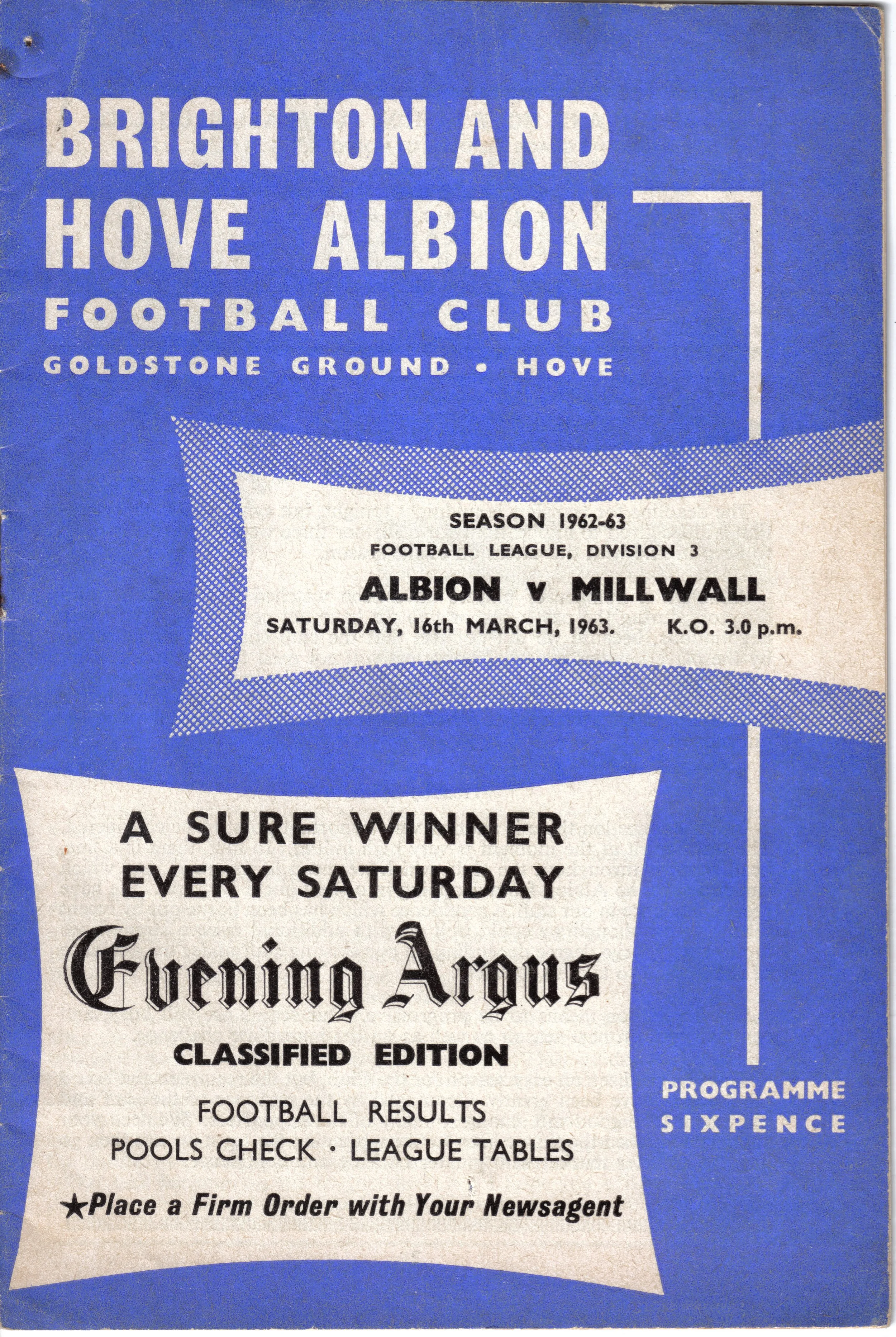 The 16-page pocket-sized programme continued for 1962/63, a season dominated not by football, but by the weather. Albion only played 5 games between Boxing Day and the beginning of March, as the country became gripped by the ‘big freeze’, with the temperature in brighton remaining below freezing for 27 days. The season eventually ended in mid-May, with Albion relegated again. The 23 league programmes were supplemented by 1 home programme in the League Cup.