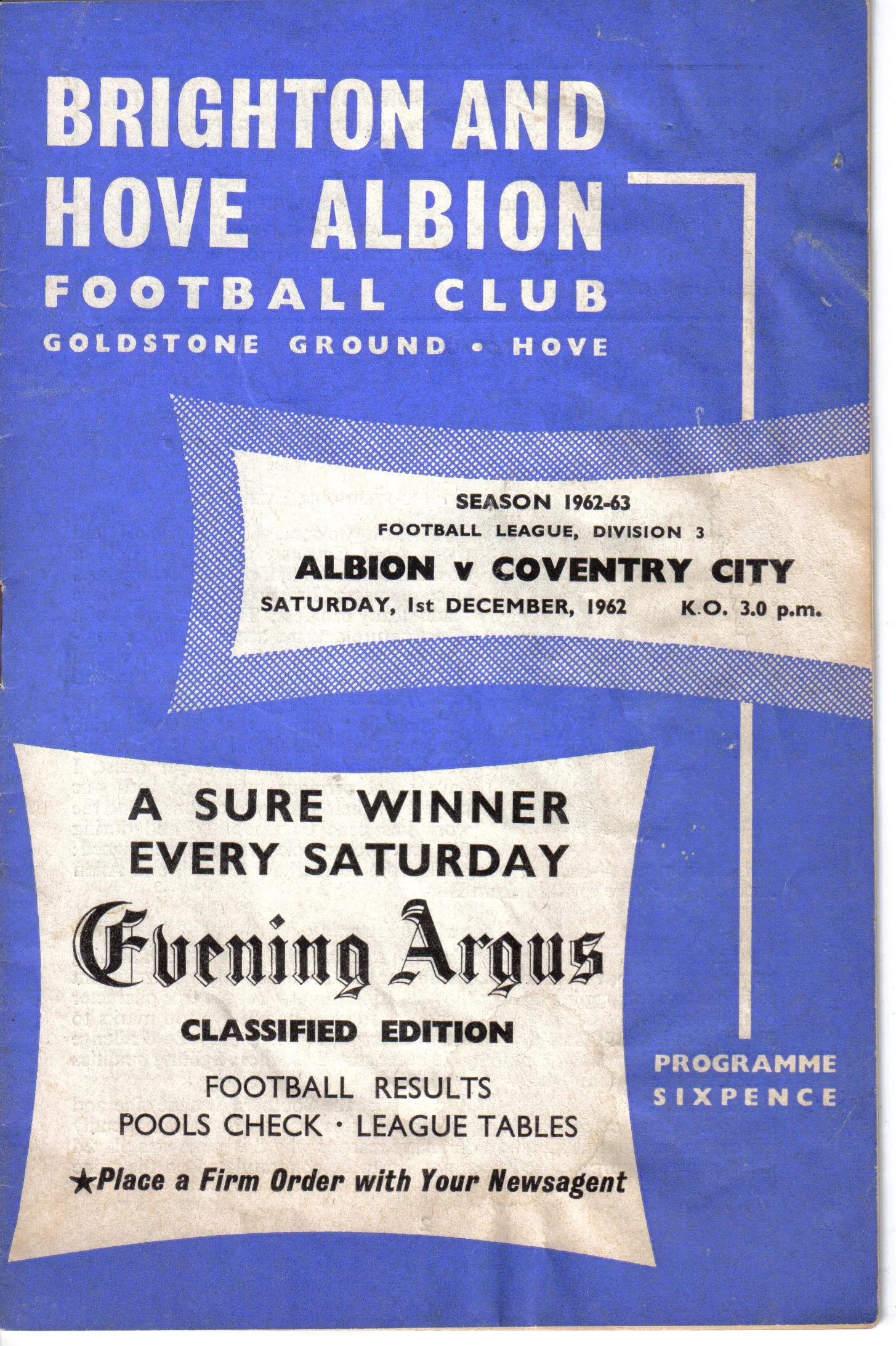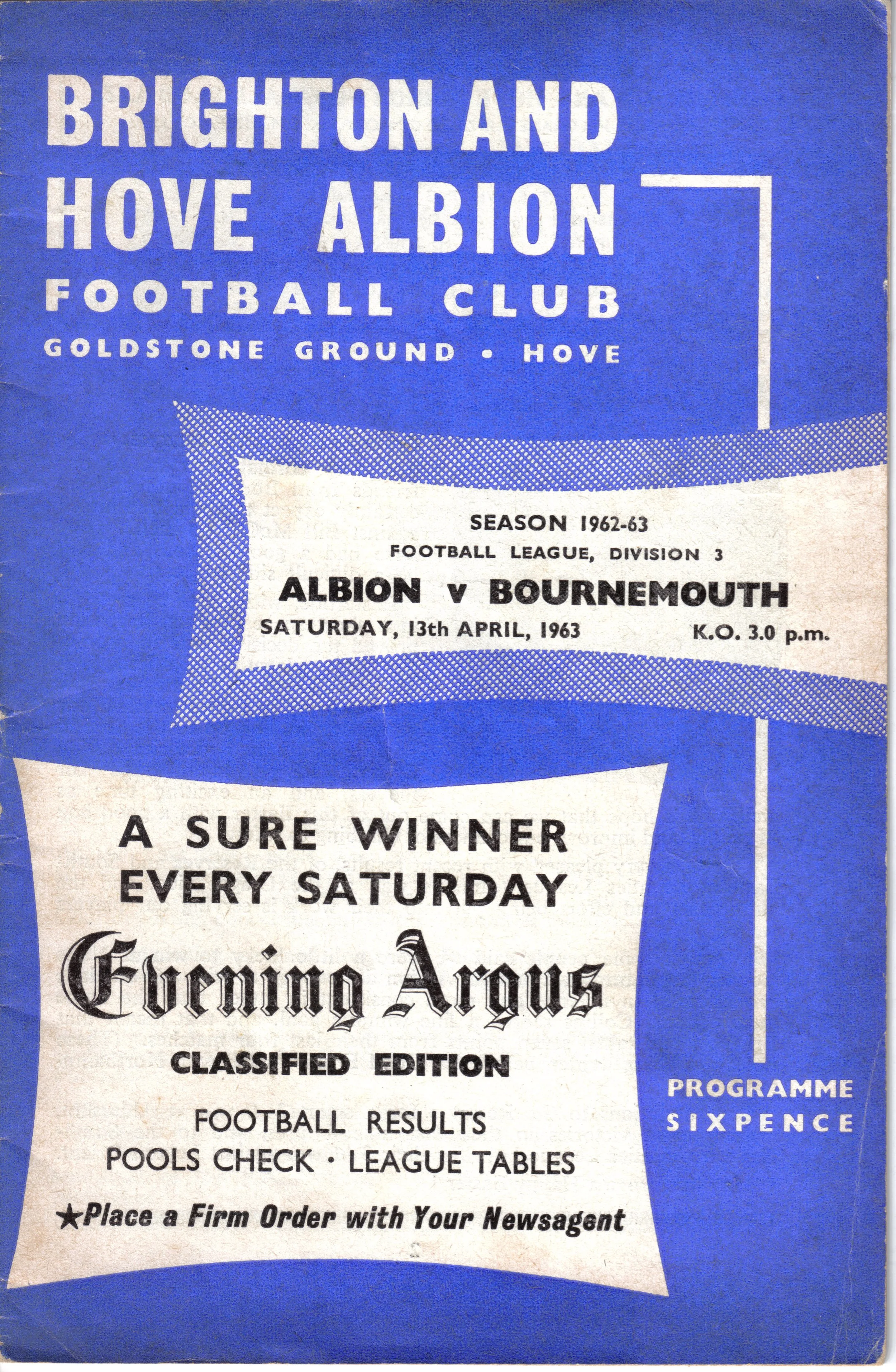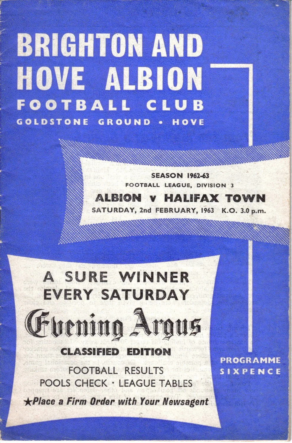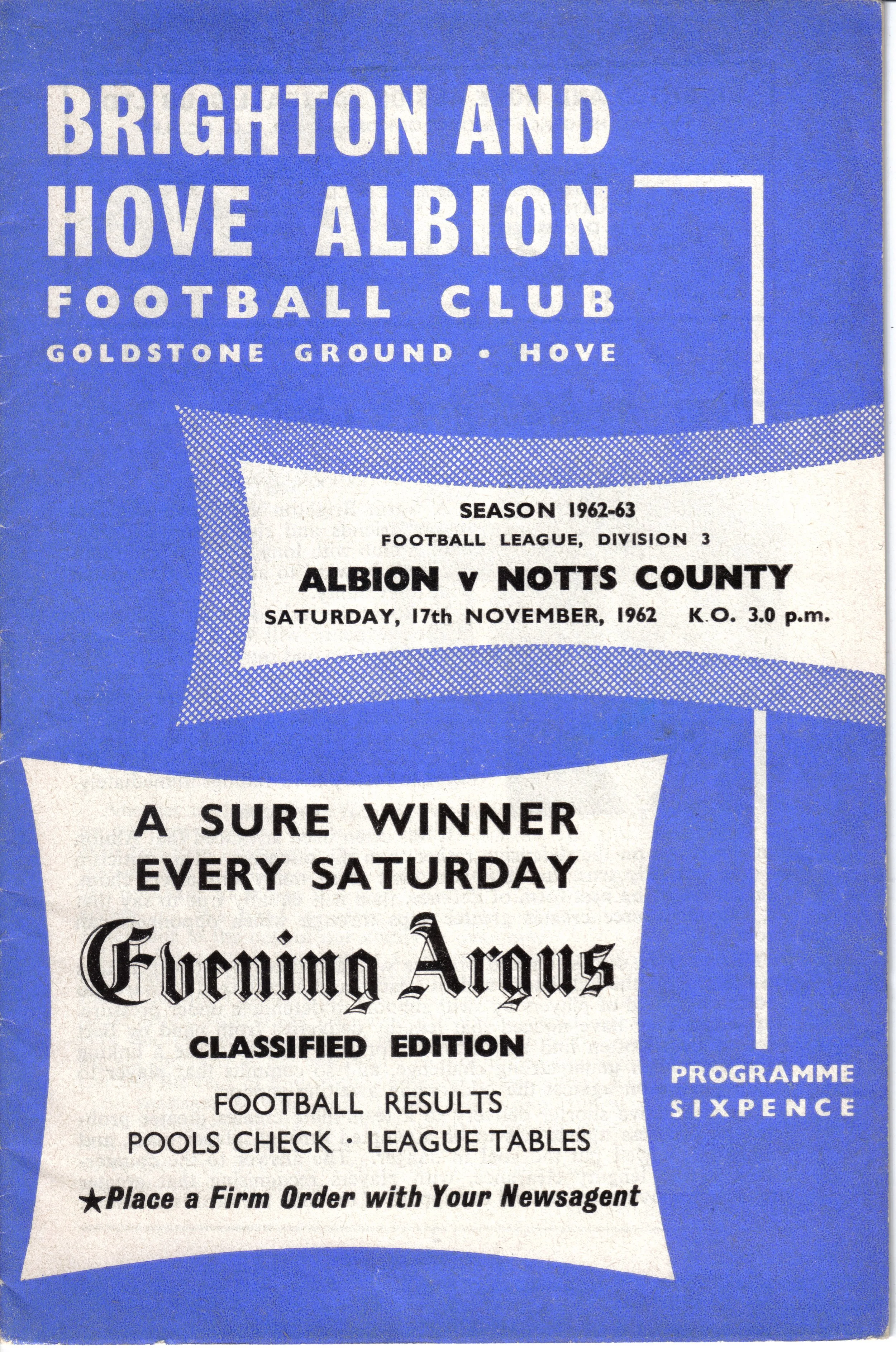 The 16-page pocket-sized programme continued for 1962/63, a season dominated not by football, but by the weather. Albion only played 5 games between Boxing Day and the beginning of March, as the country became gripped by the ‘big freeze’, with the temperature in brighton remaining below freezing for 27 days. The season eventually ended in mid-May, with Albion relegated again. The 23 league programmes were supplemented by 1 home programme in the League Cup.