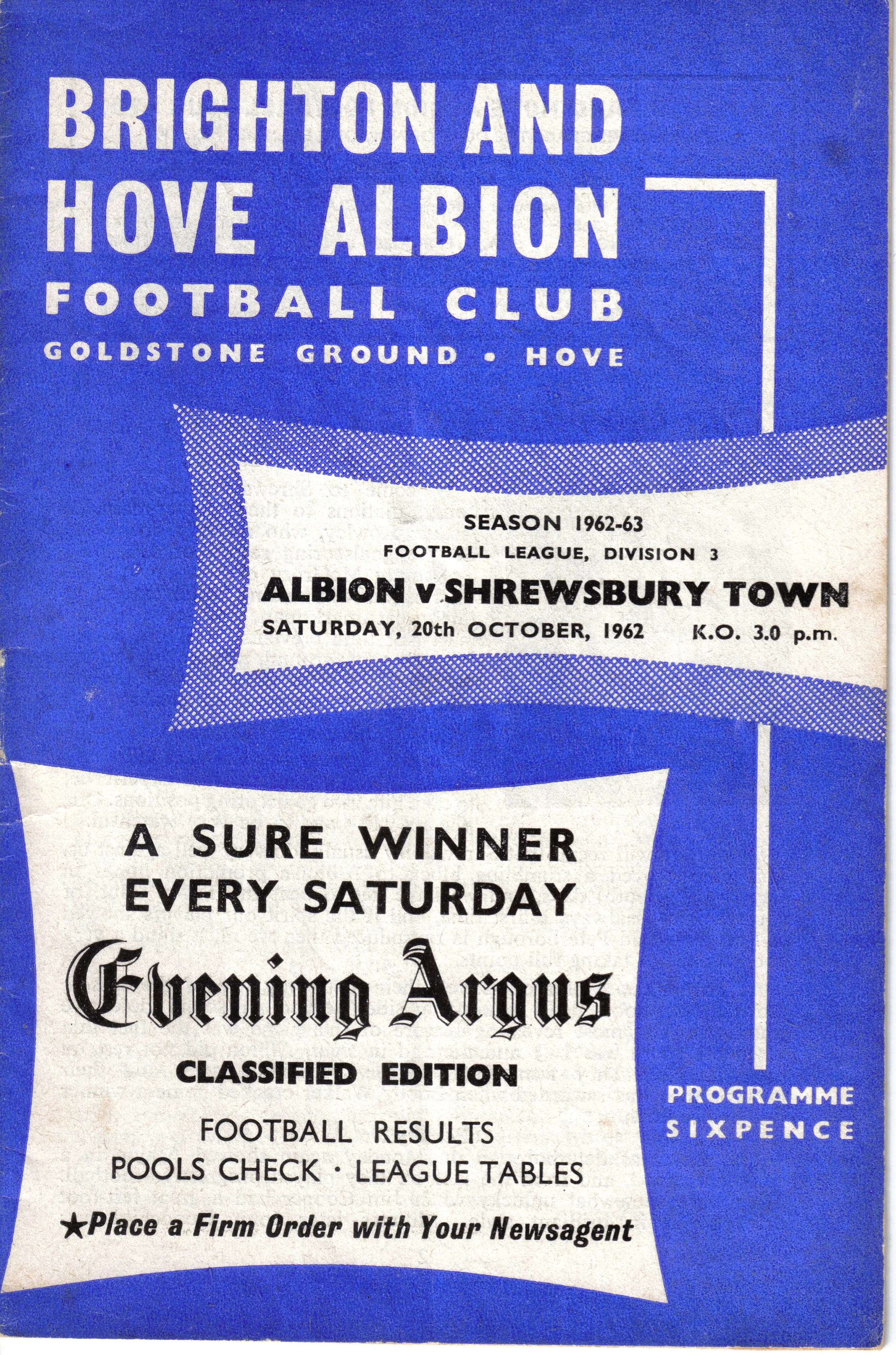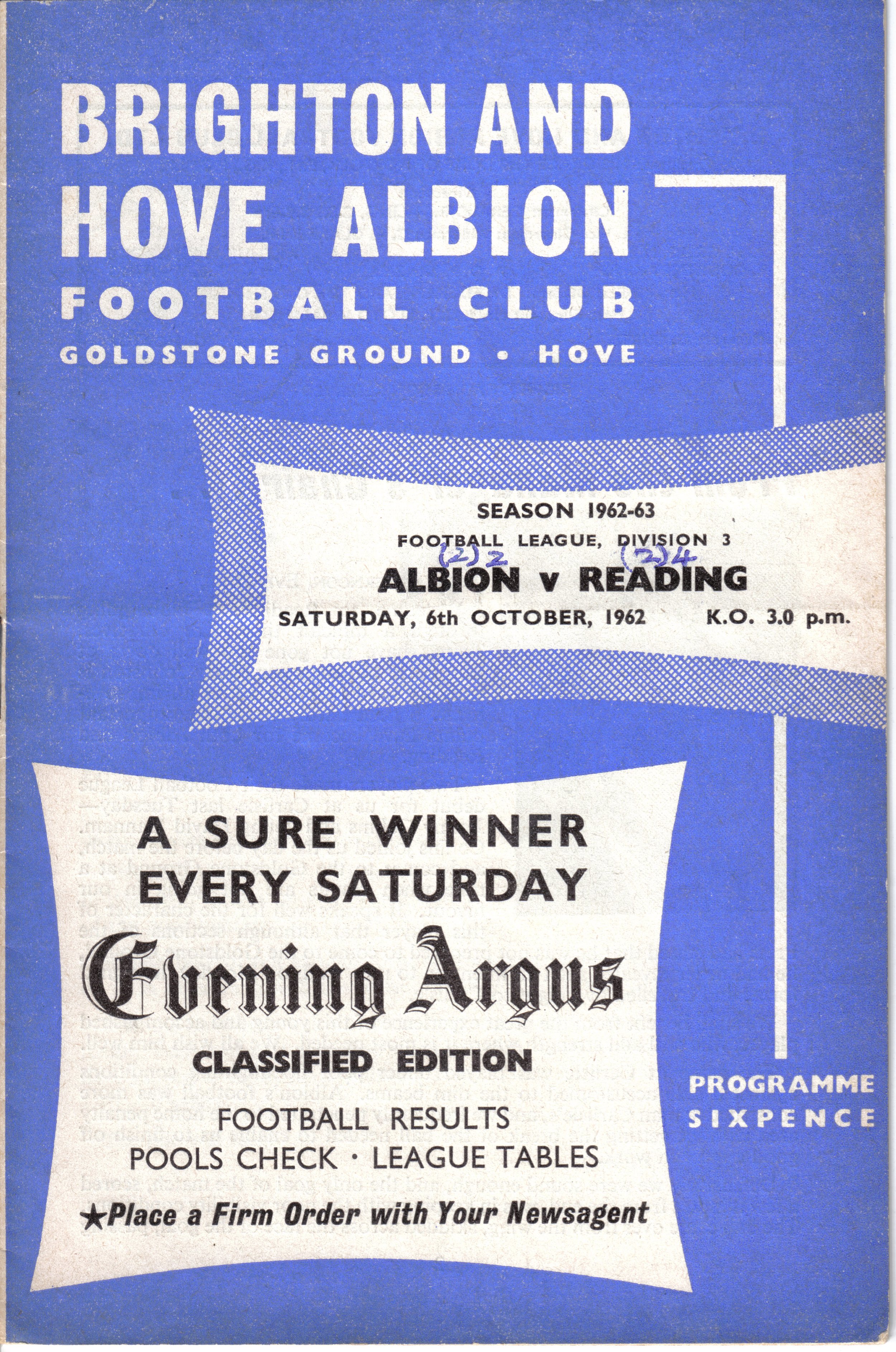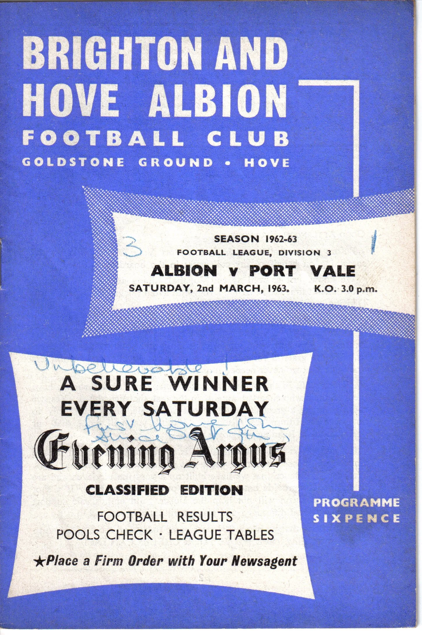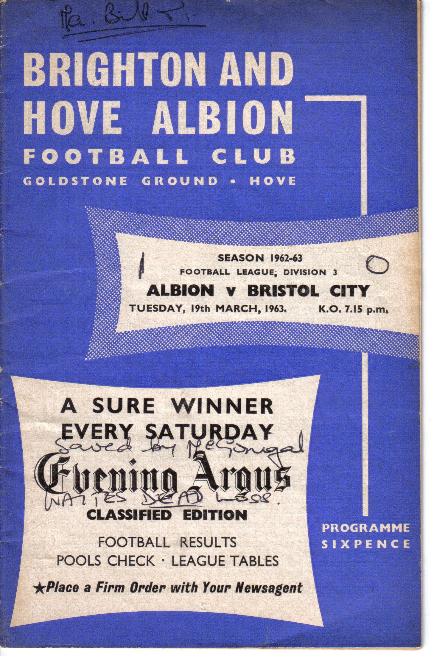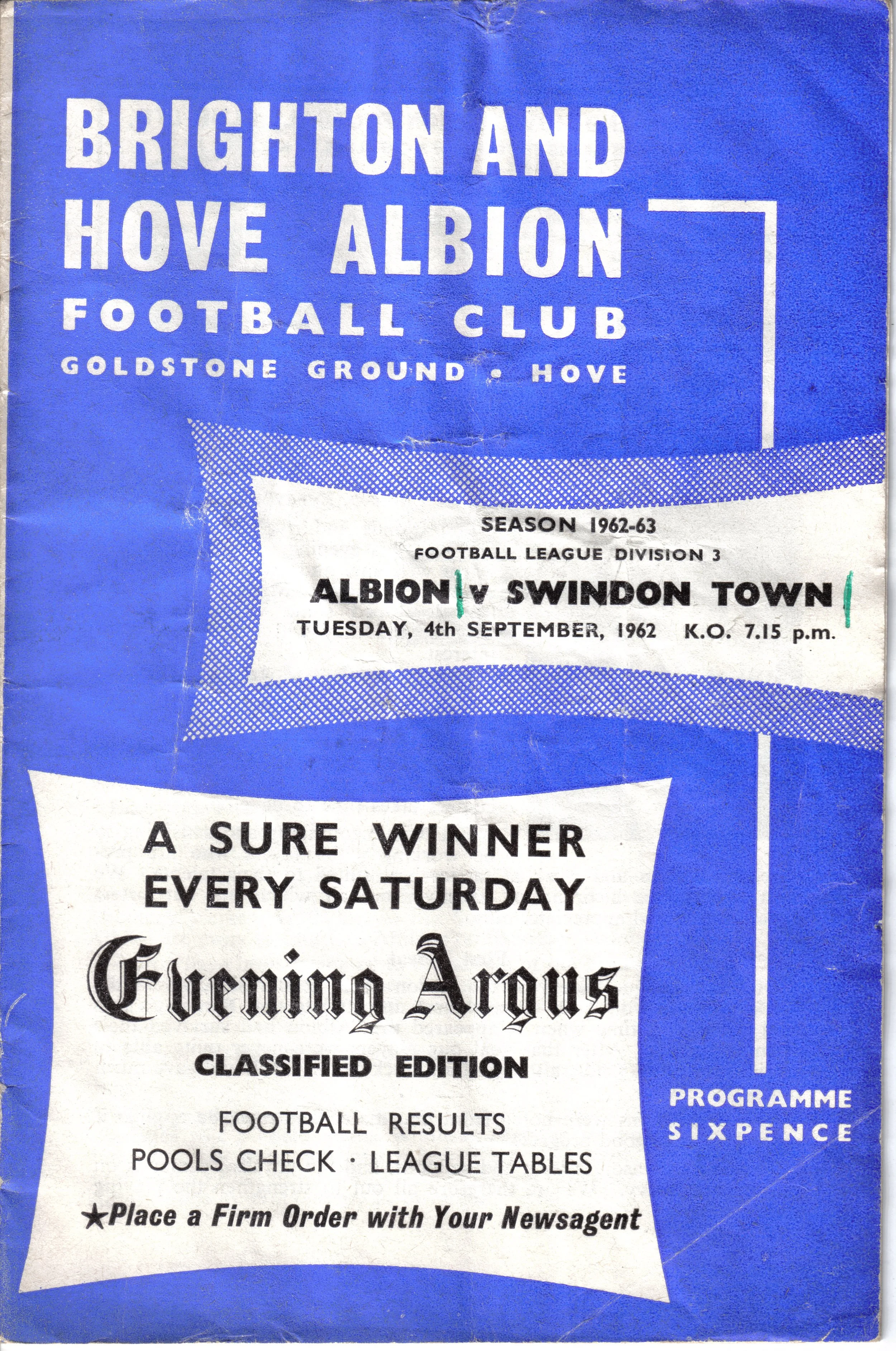 The 16-page pocket-sized programme continued for 1962/63, a season dominated not by football, but by the weather. Albion only played 5 games between Boxing Day and the beginning of March, as the country became gripped by the ‘big freeze’, with the temperature in brighton remaining below freezing for 27 days. The season eventually ended in mid-May, with Albion relegated again. The 23 league programmes were supplemented by 1 home programme in the League Cup.