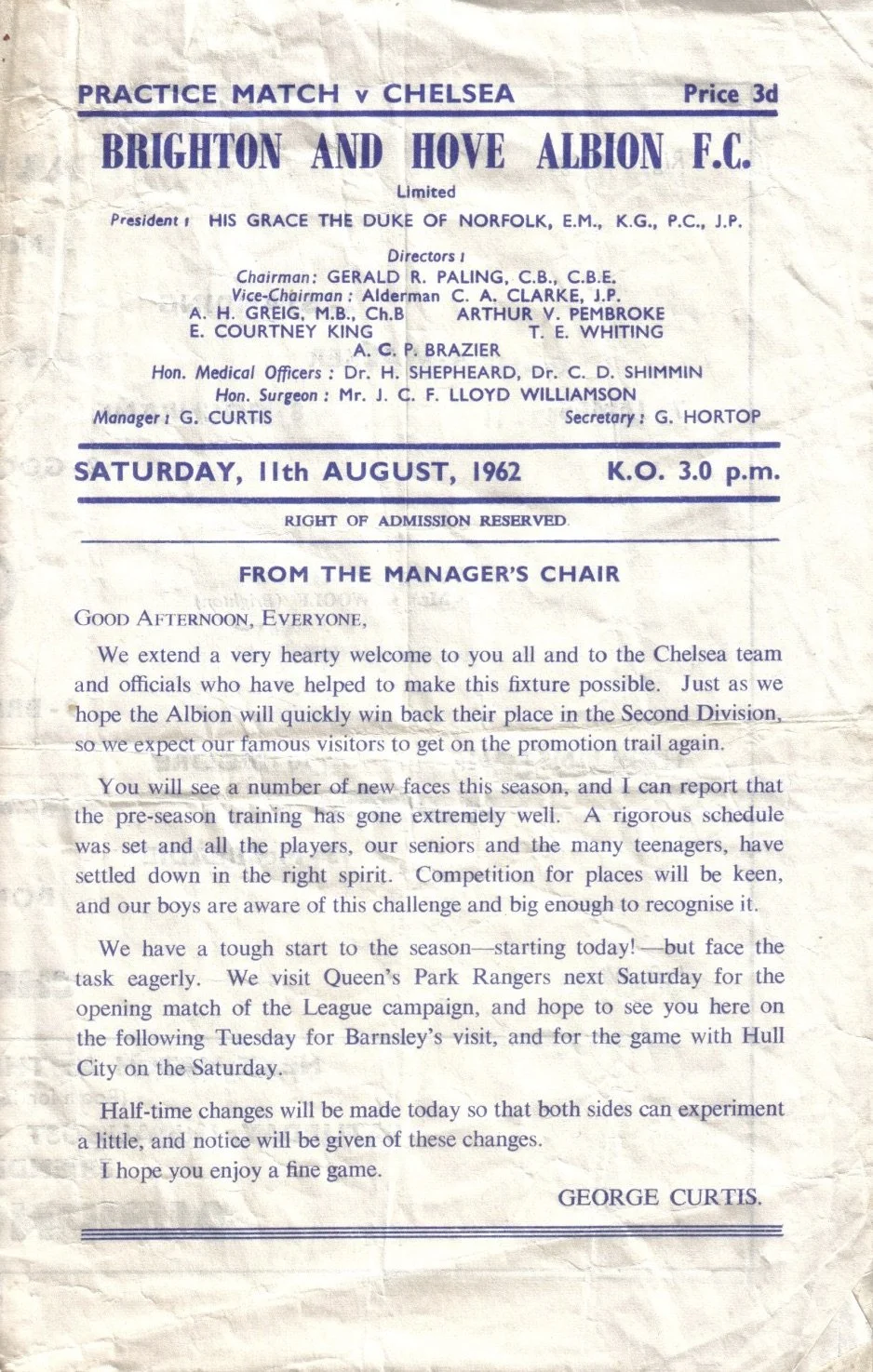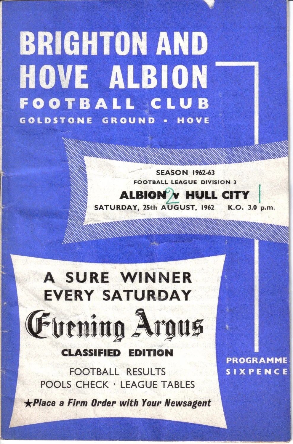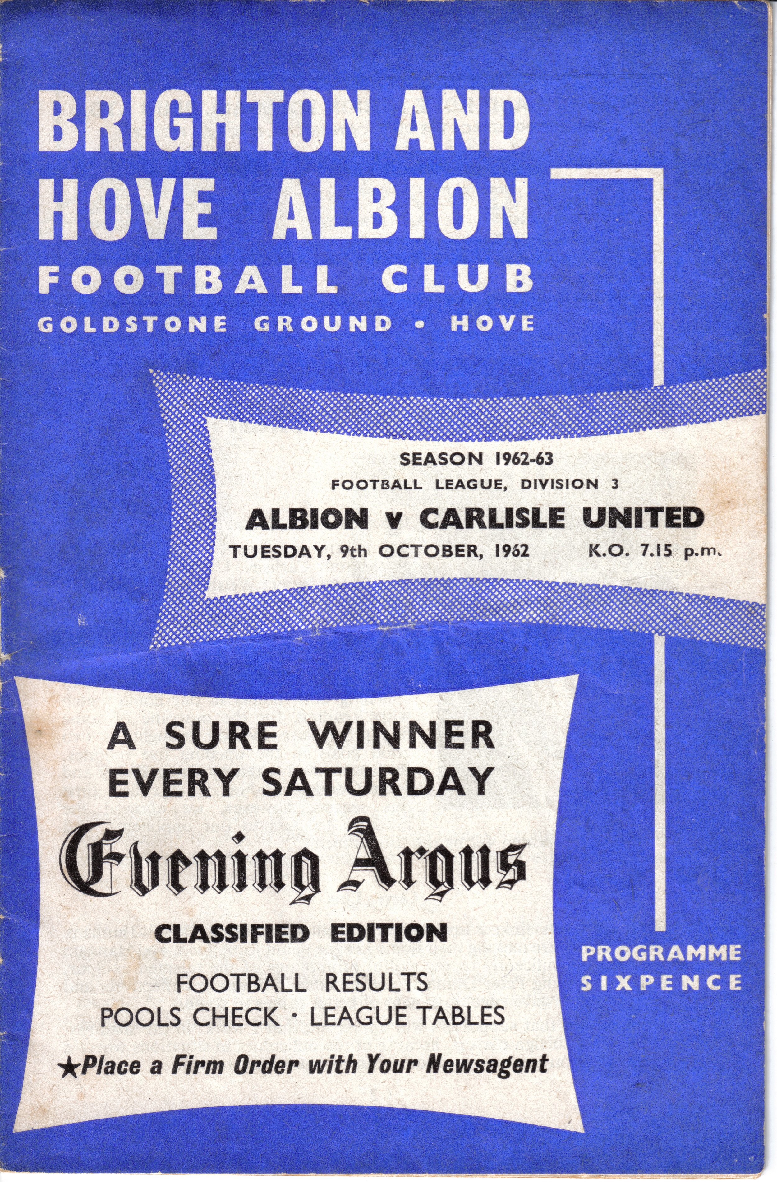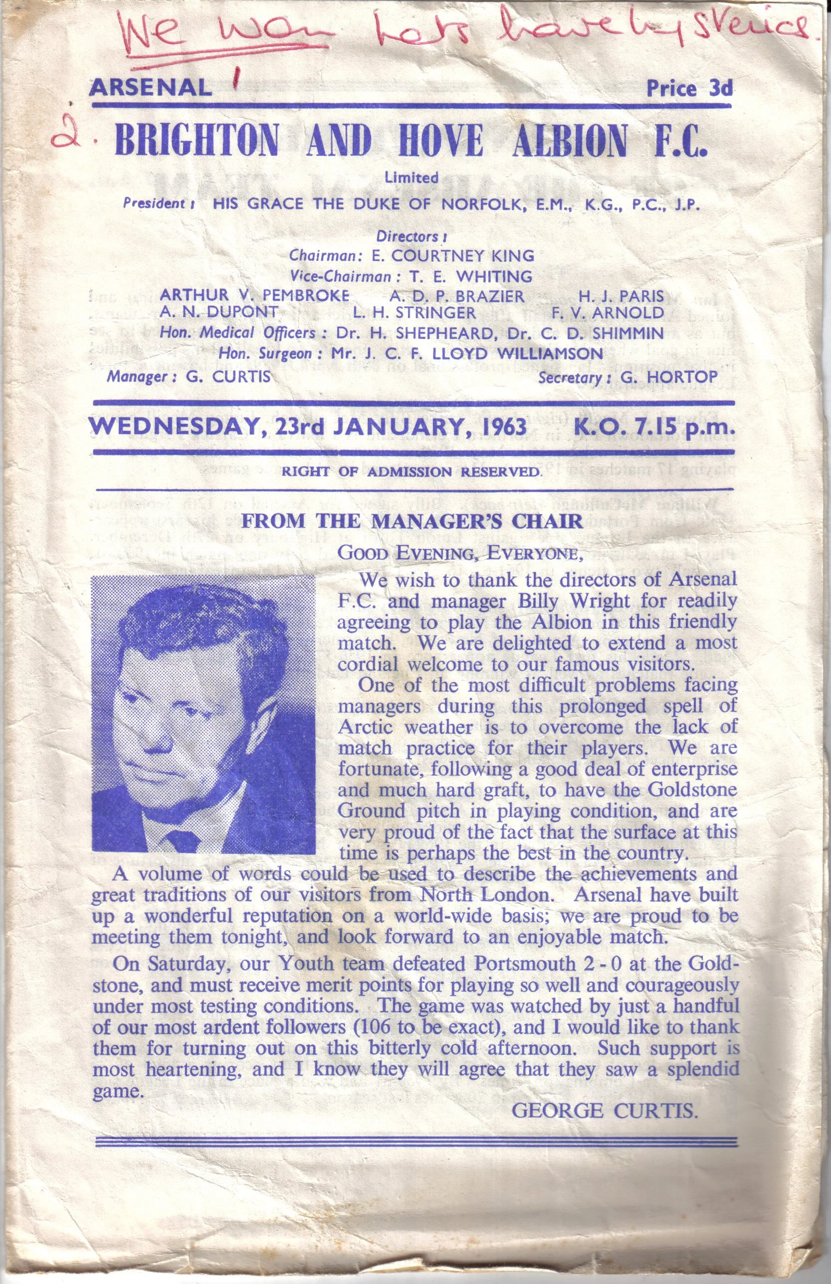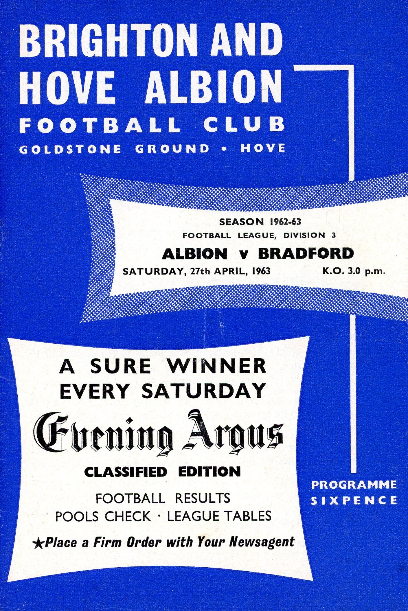 The 16-page pocket-sized programme continued for 1962/63, a season dominated not by football, but by the weather. Albion only played 5 games between Boxing Day and the beginning of March, as the country became gripped by the ‘big freeze’, with the temperature in brighton remaining below freezing for 27 days. The season eventually ended in mid-May, with Albion relegated again. The 23 league programmes were supplemented by 1 home programme in the League Cup.
