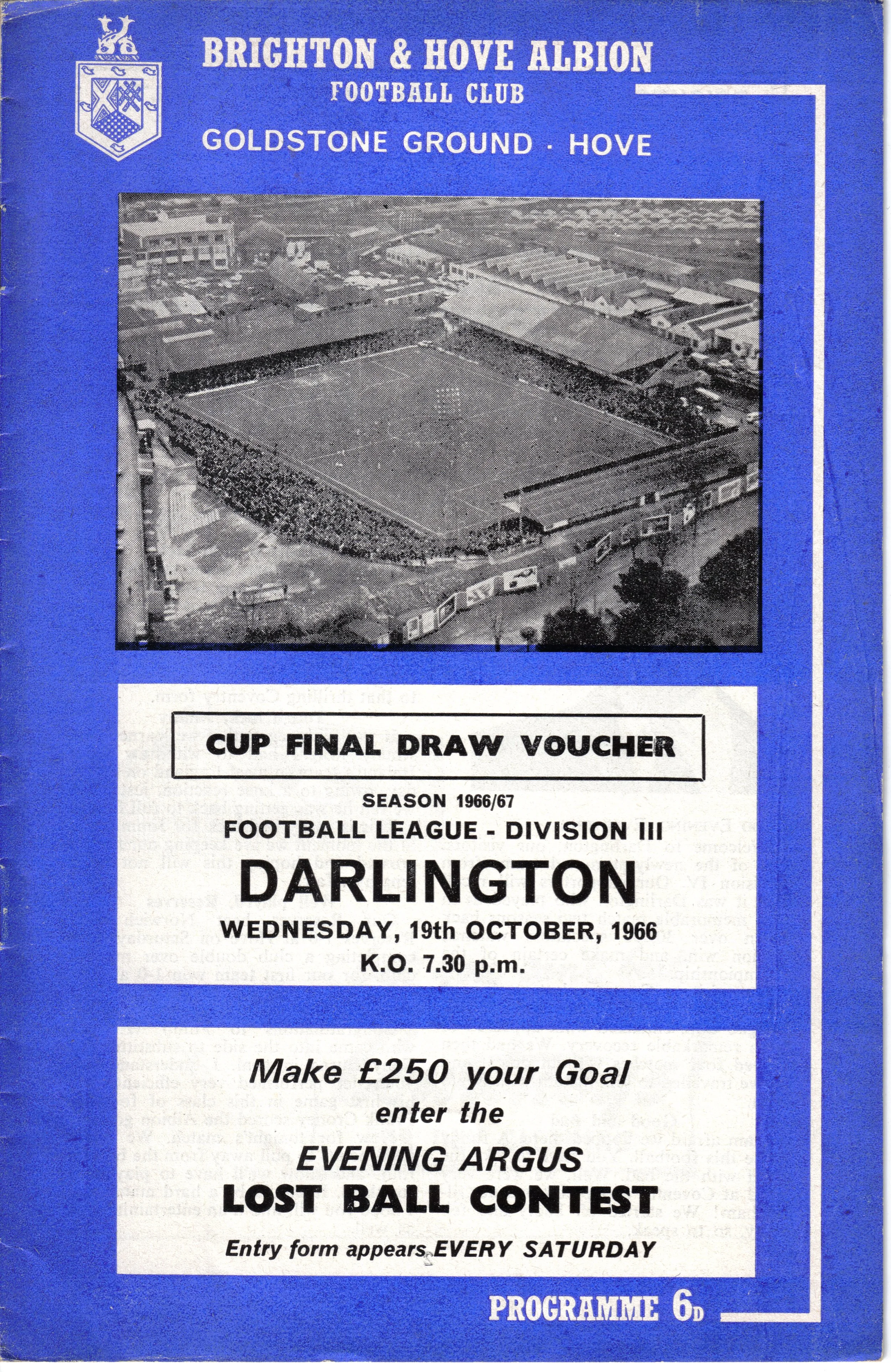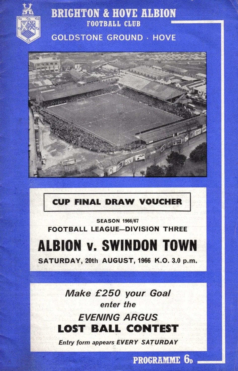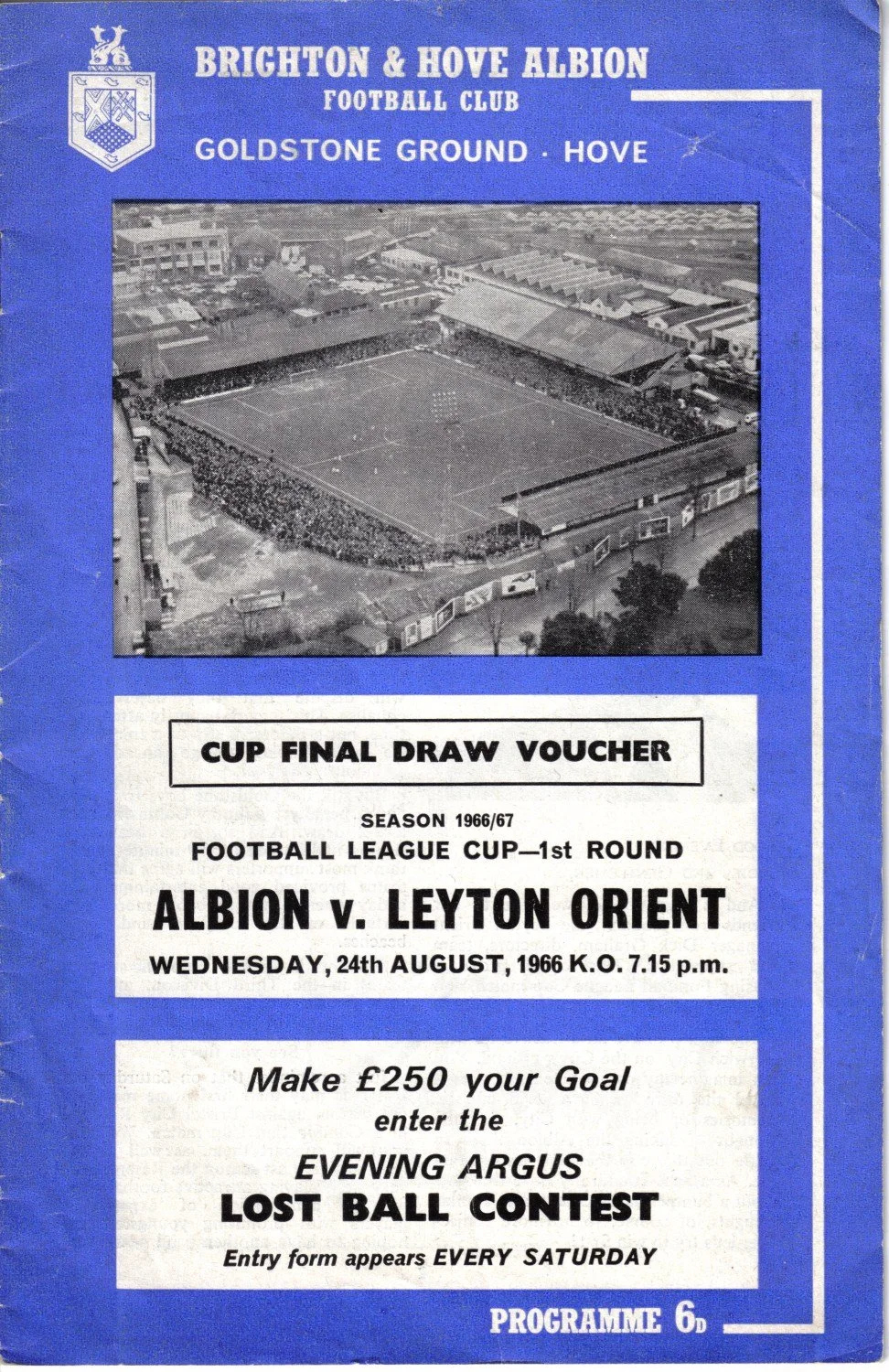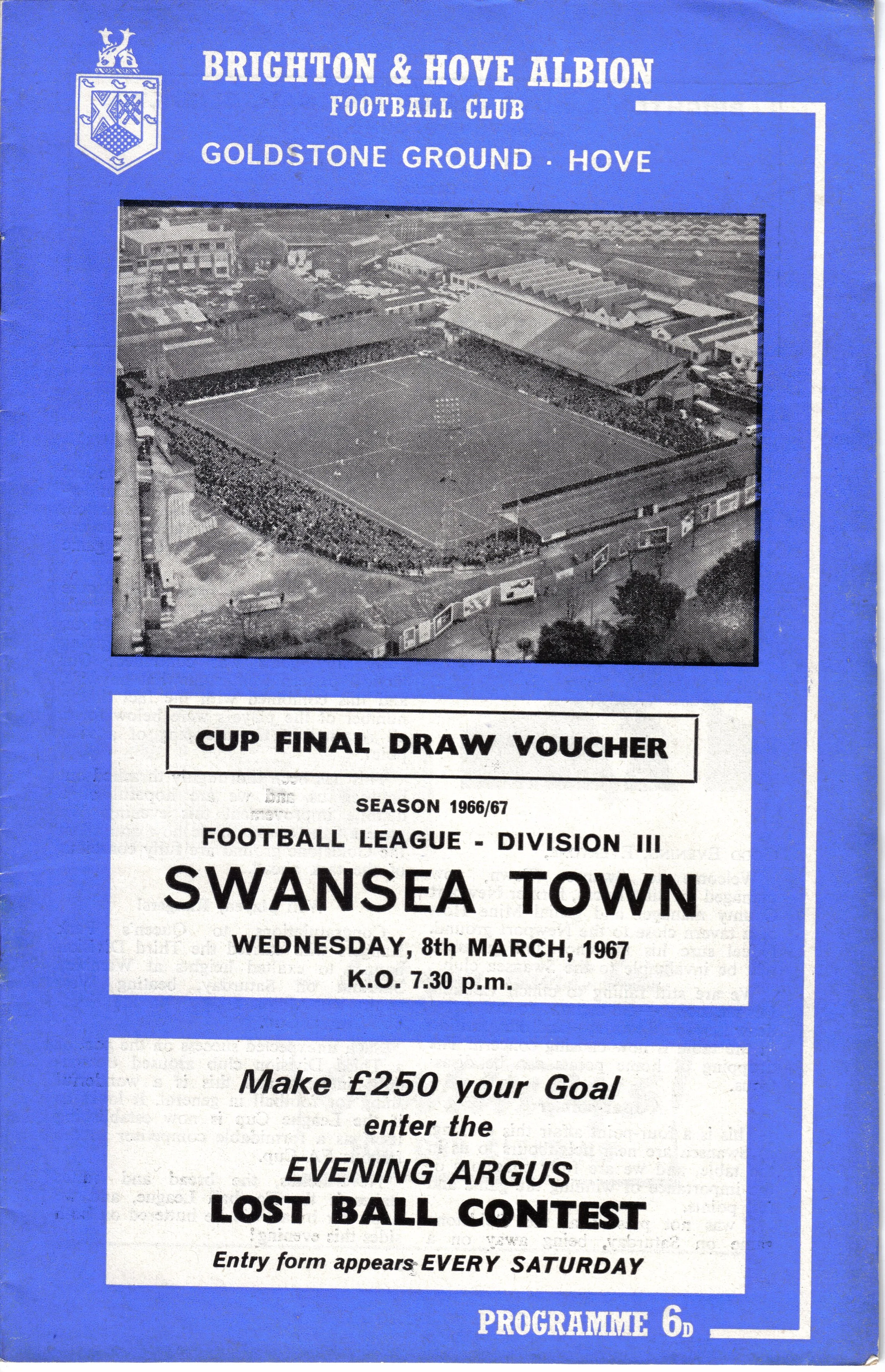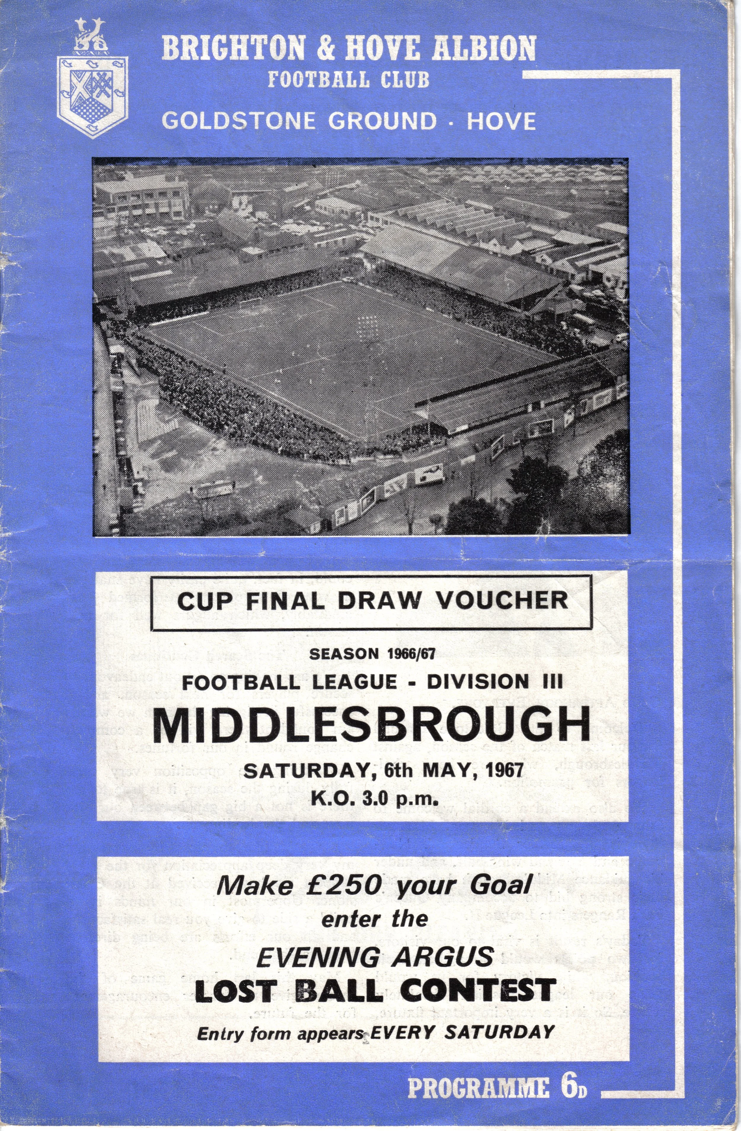 A return to a larger format for the campaign following England’s World Cup triumph. The 16-page issue contained a good mix of news, information, stats and the inevitable advertising. The mainly blue cover carried an aerial photo of the Goldstone, over the match details and an advert for the Evening Argus. As well as the 23 league programmes, Albion played three home matches in the League Cup and two in the FA Cup. The latter of those, the 4th round tie against Chelsea, saw the appearance of a couple of ‘Pirate’ programmes. These were usually very poor productions, designed purely to make money for the publishers. The attendance at the game was 35,000, so they had a captive audience! Programmes were issued for two pre-season friendlies in mid-August, against Maccabi Tel-Aviv and Sheffield United.