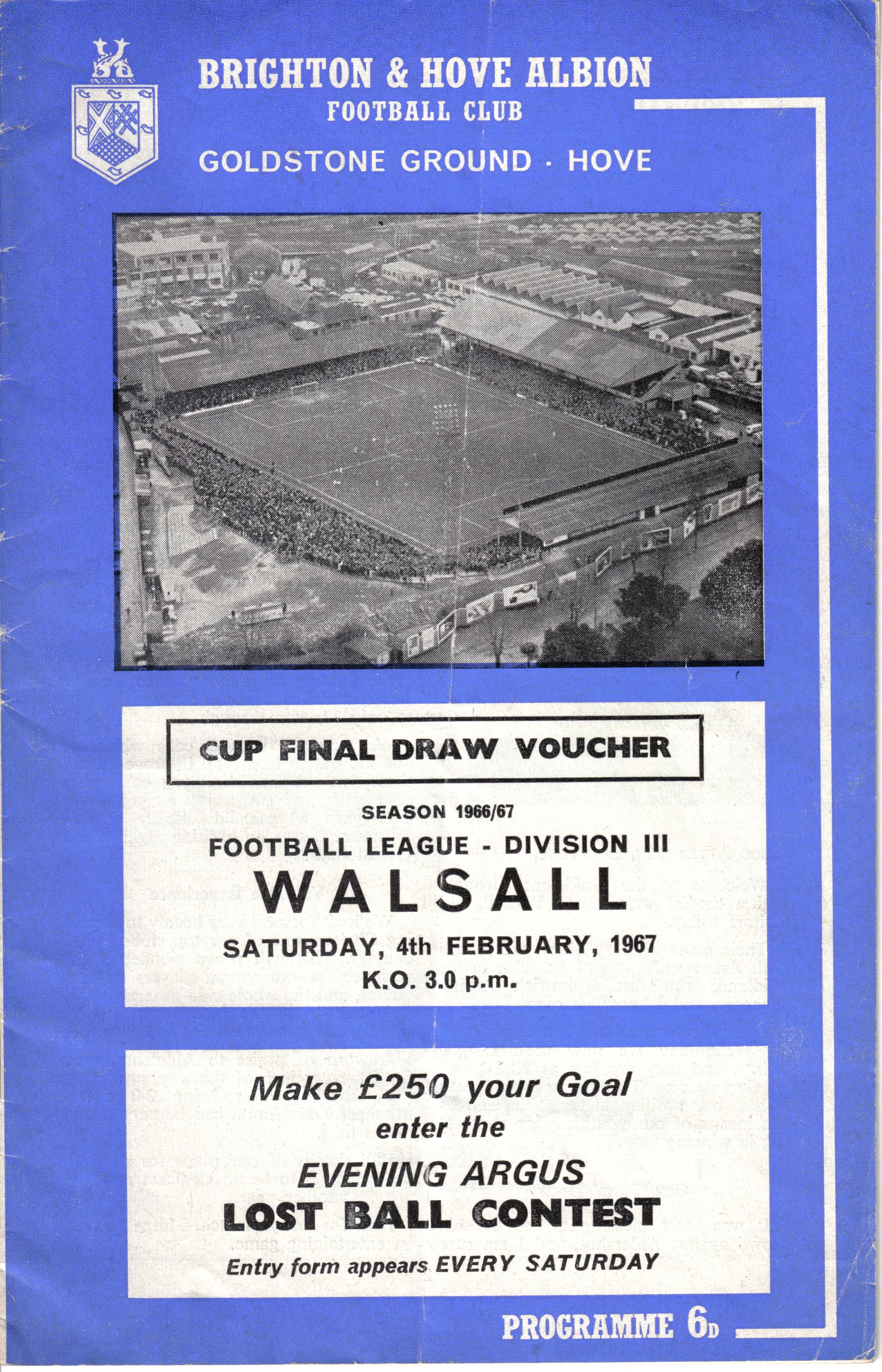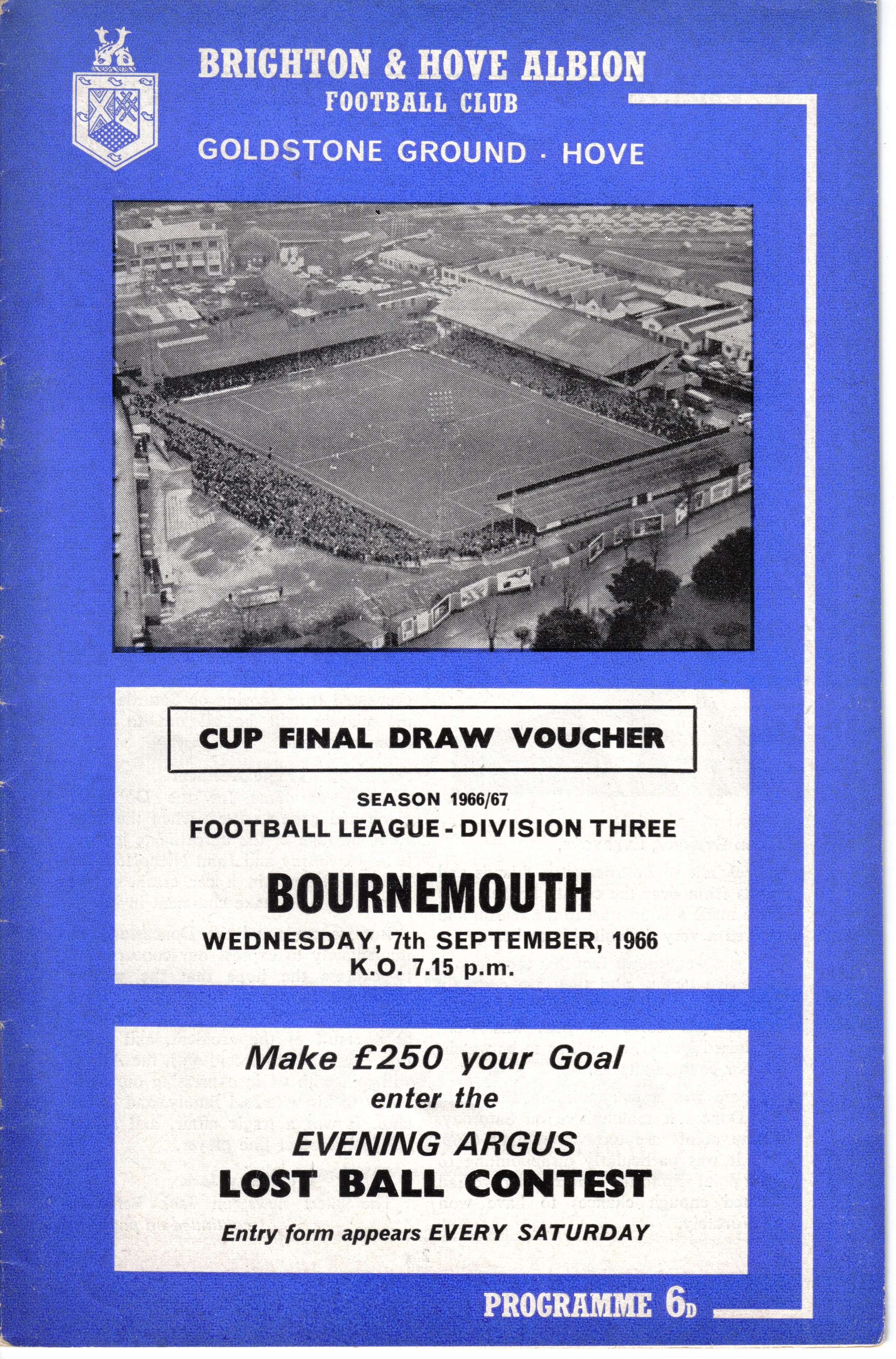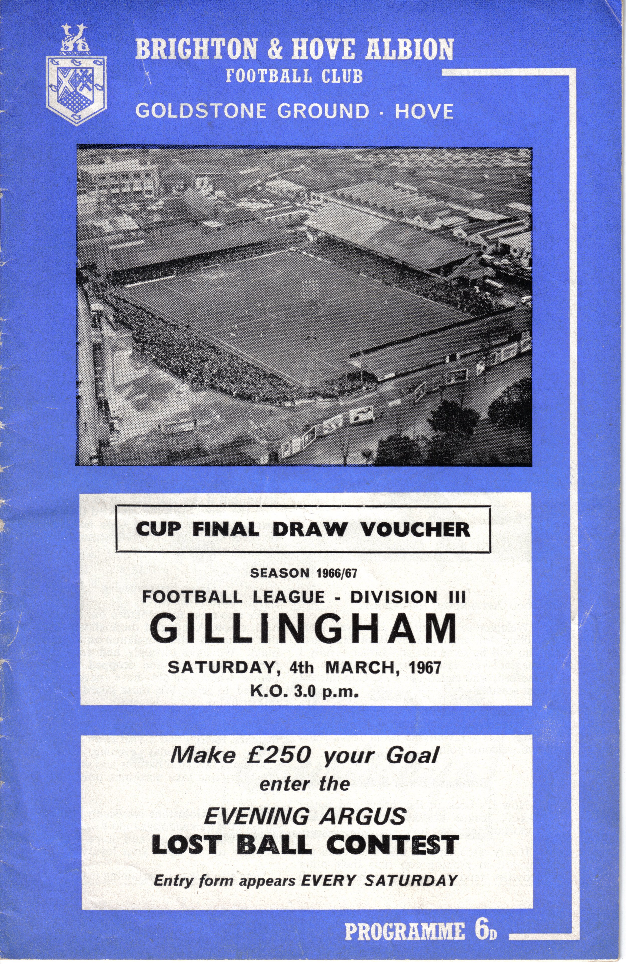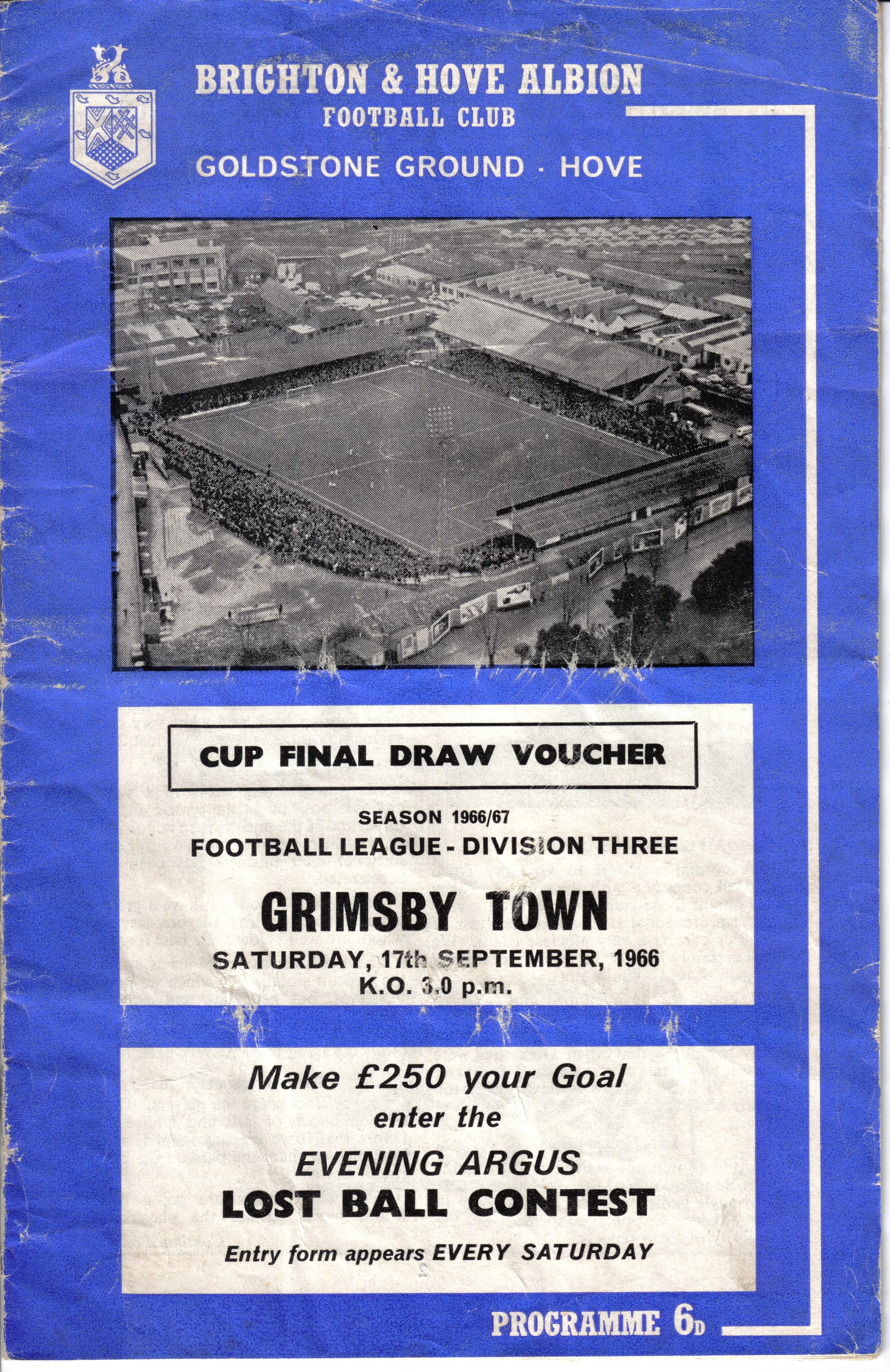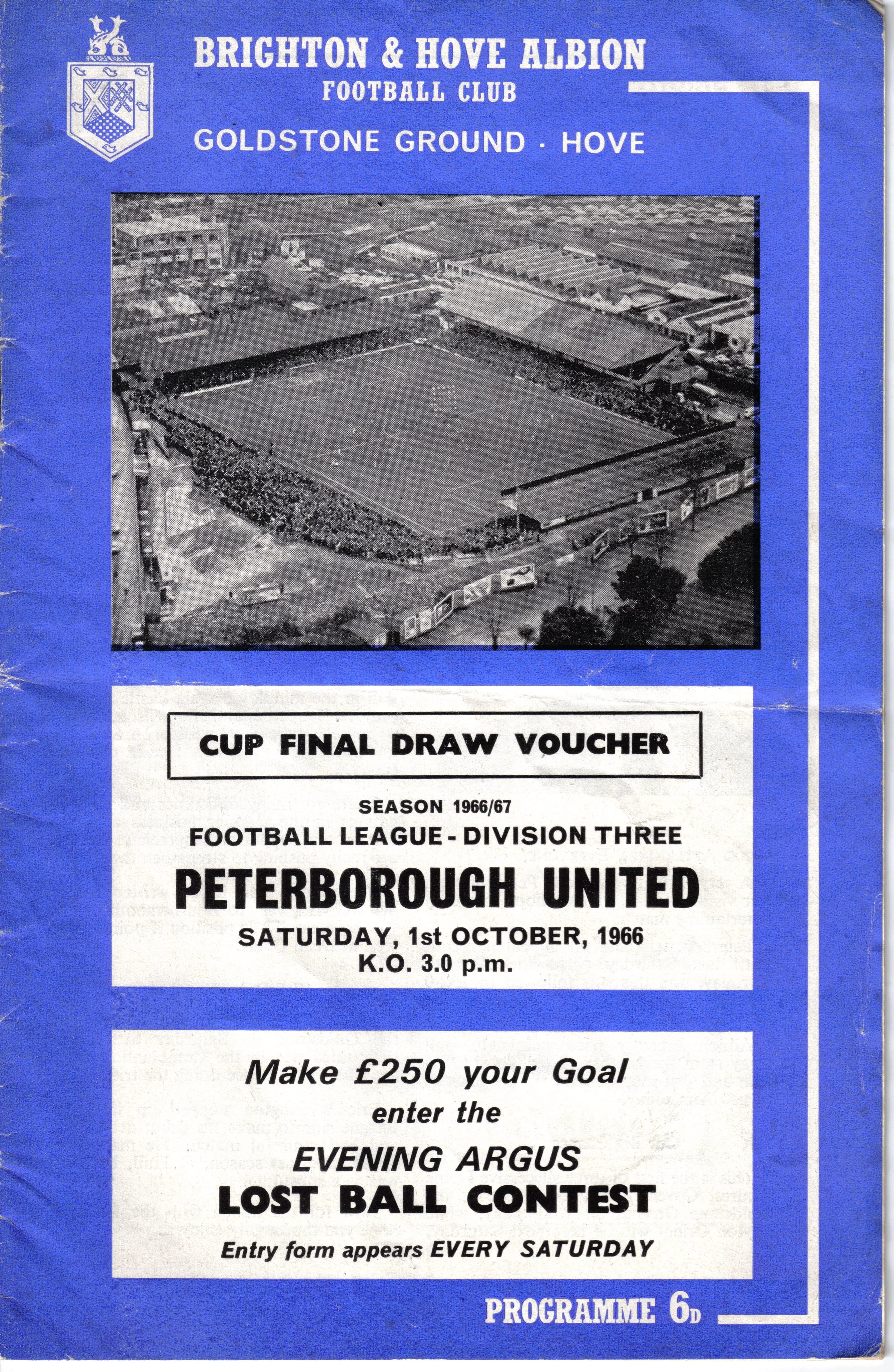 A return to a larger format for the campaign following England’s World Cup triumph. The 16-page issue contained a good mix of news, information, stats and the inevitable advertising. The mainly blue cover carried an aerial photo of the Goldstone, over the match details and an advert for the Evening Argus. As well as the 23 league programmes, Albion played three home matches in the League Cup and two in the FA Cup. The latter of those, the 4th round tie against Chelsea, saw the appearance of a couple of ‘Pirate’ programmes. These were usually very poor productions, designed purely to make money for the publishers. The attendance at the game was 35,000, so they had a captive audience! Programmes were issued for two pre-season friendlies in mid-August, against Maccabi Tel-Aviv and Sheffield United.