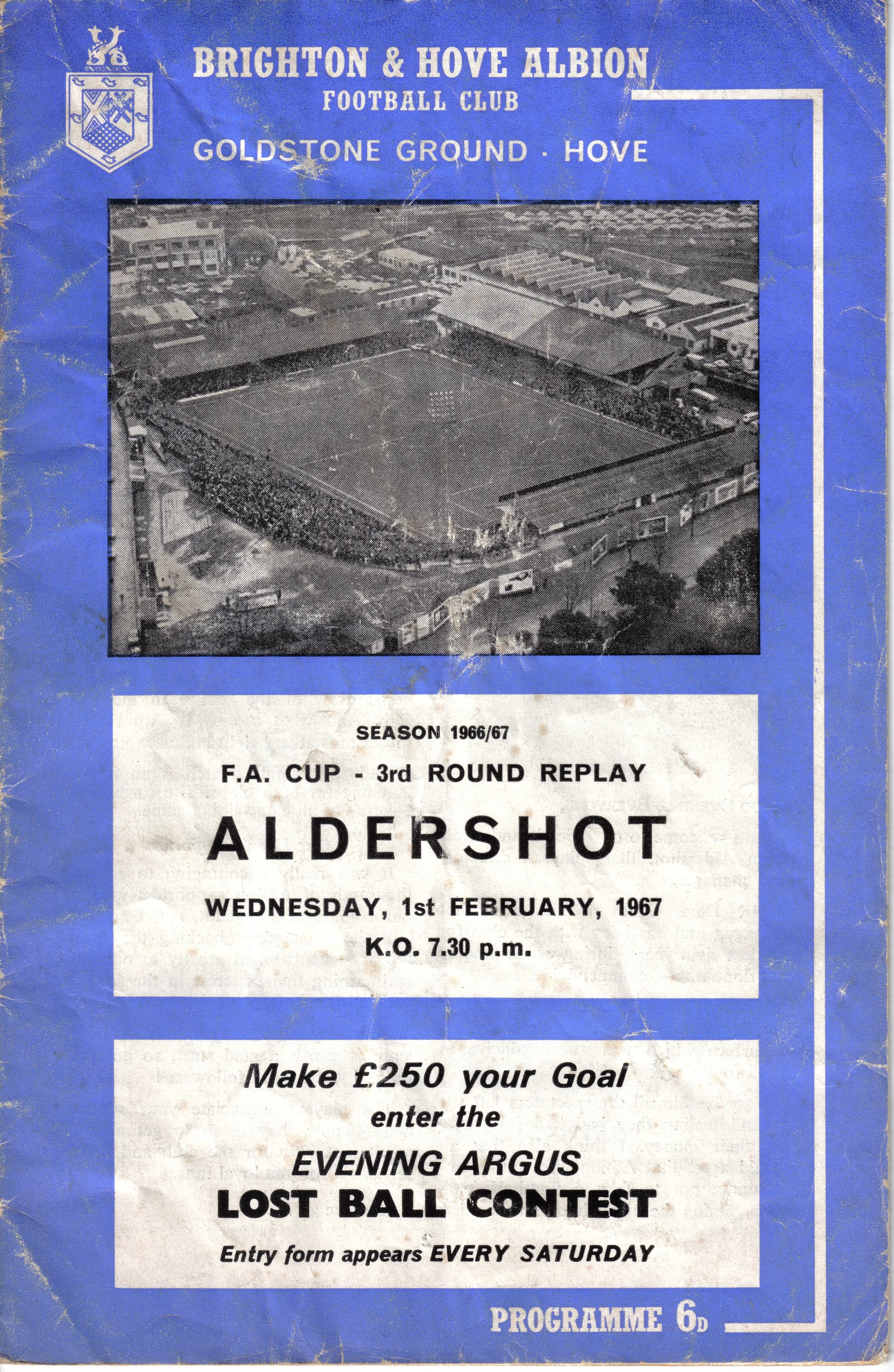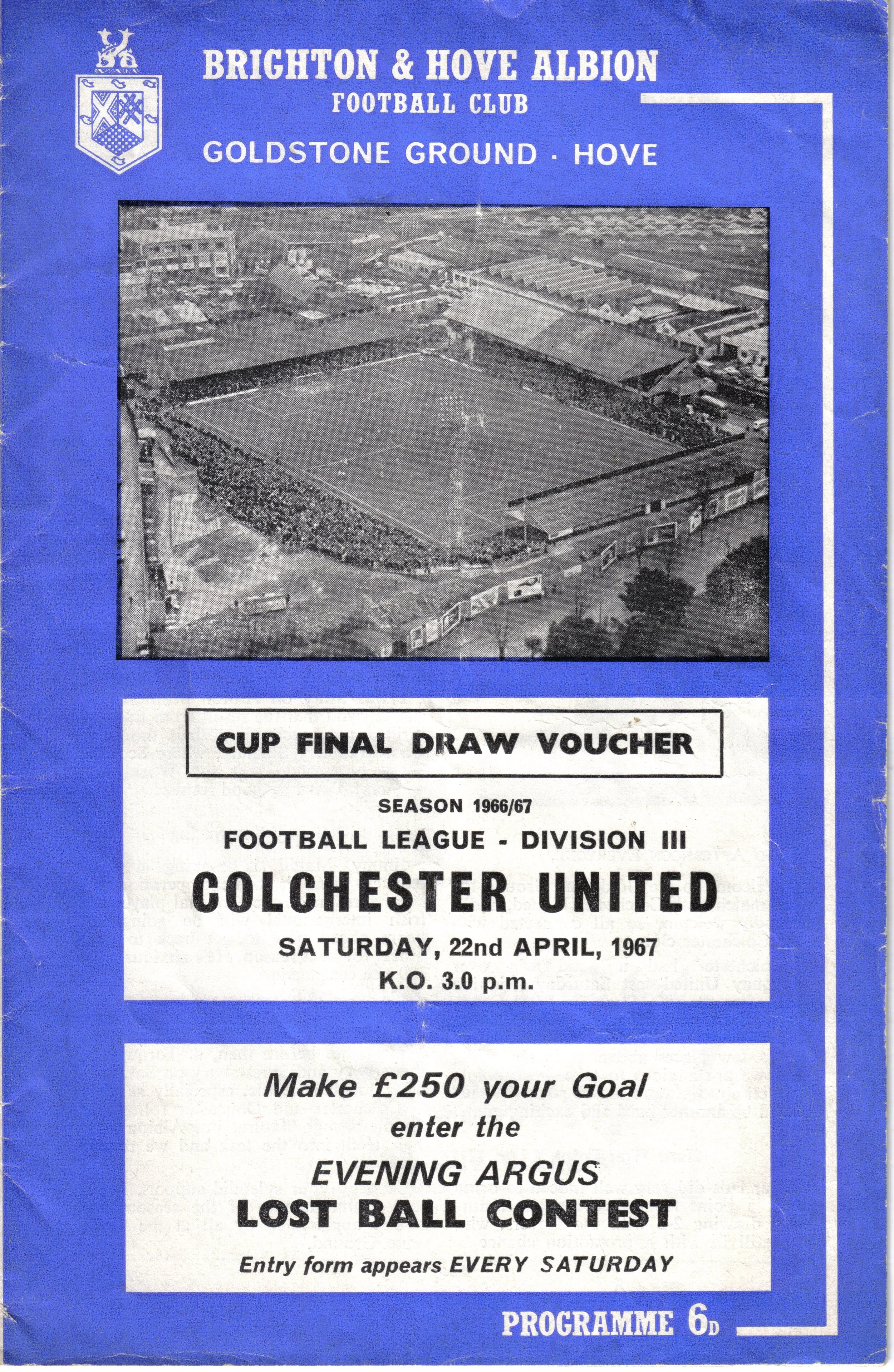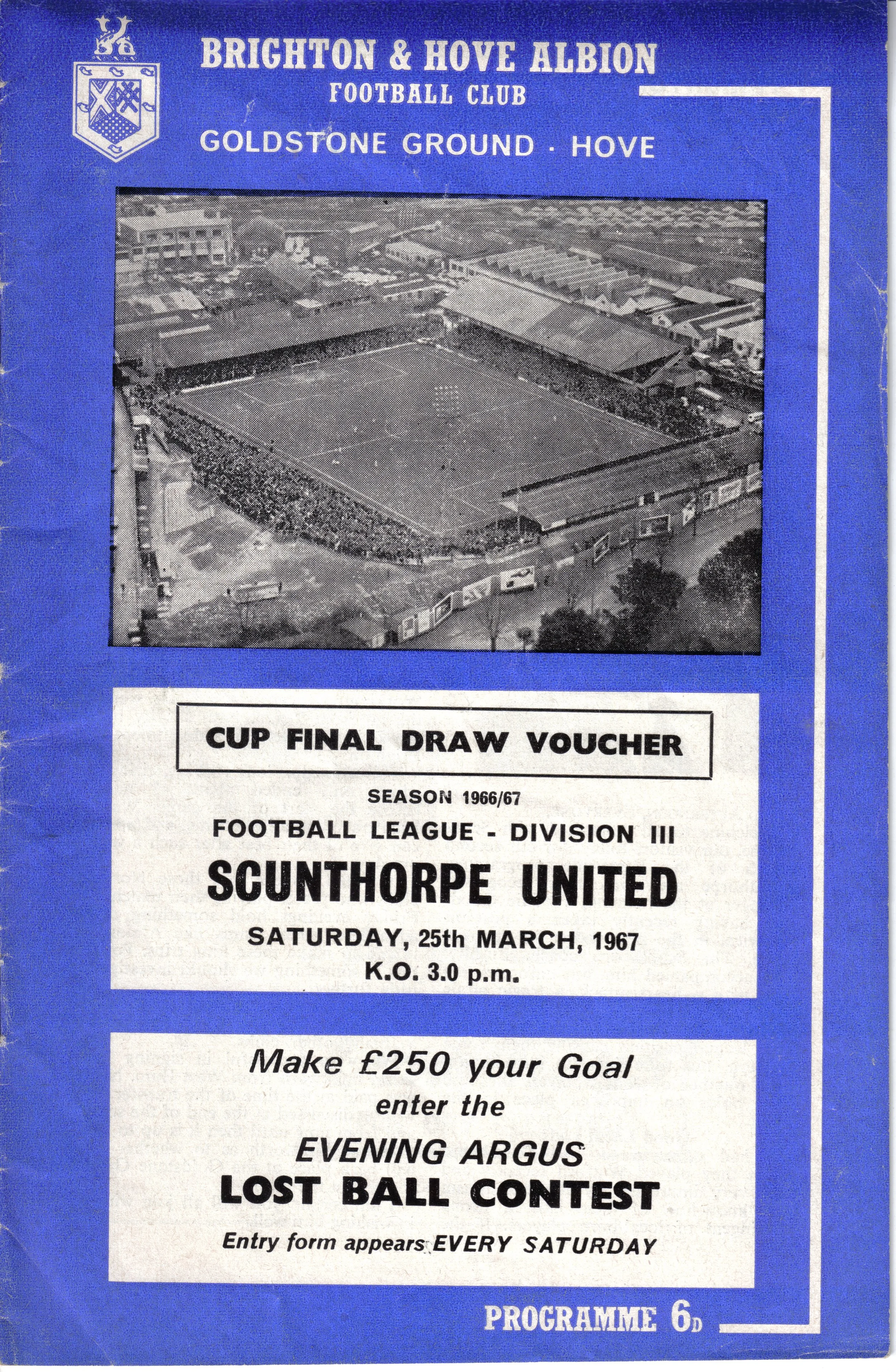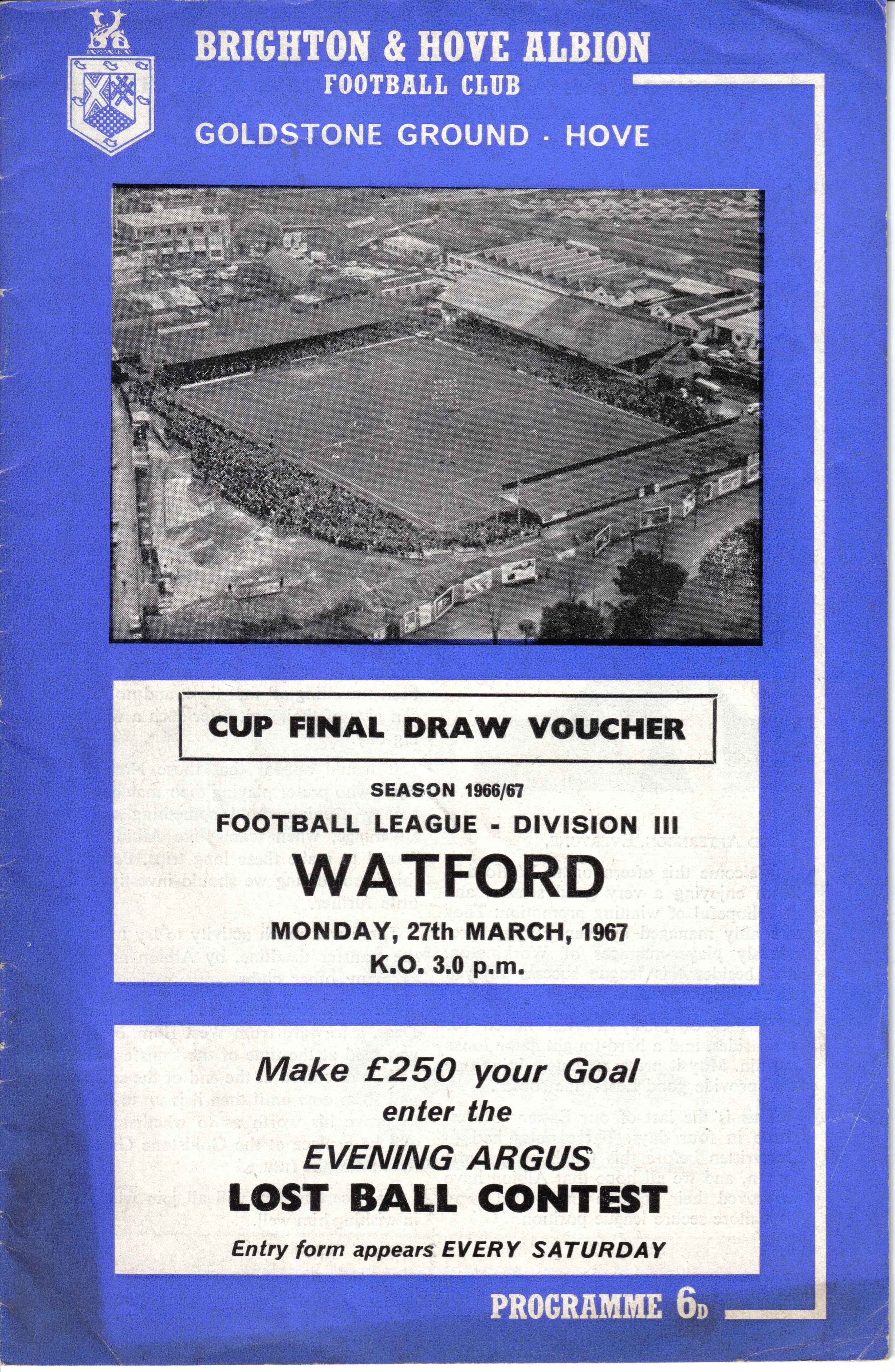 A return to a larger format for the campaign following England’s World Cup triumph. The 16-page issue contained a good mix of news, information, stats and the inevitable advertising. The mainly blue cover carried an aerial photo of the Goldstone, over the match details and an advert for the Evening Argus. As well as the 23 league programmes, Albion played three home matches in the League Cup and two in the FA Cup. The latter of those, the 4th round tie against Chelsea, saw the appearance of a couple of ‘Pirate’ programmes. These were usually very poor productions, designed purely to make money for the publishers. The attendance at the game was 35,000, so they had a captive audience! Programmes were issued for two pre-season friendlies in mid-August, against Maccabi Tel-Aviv and Sheffield United.
