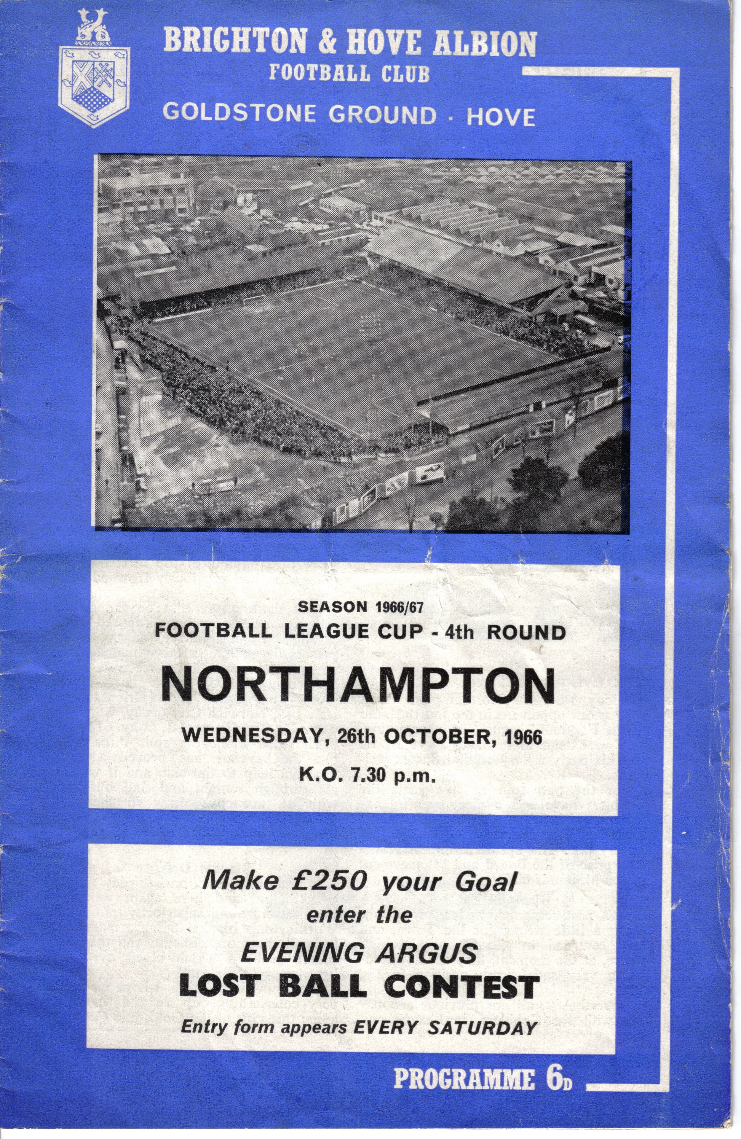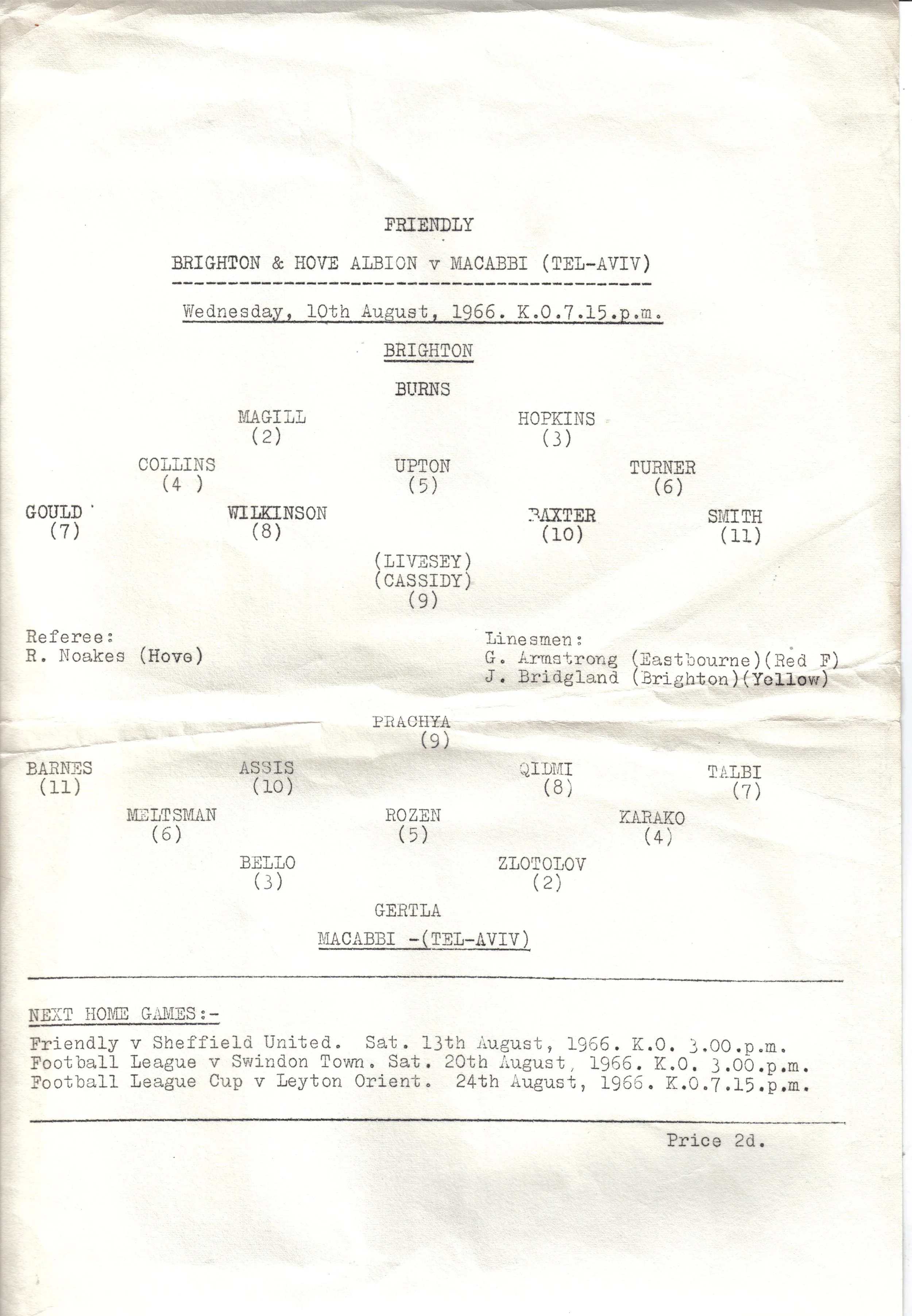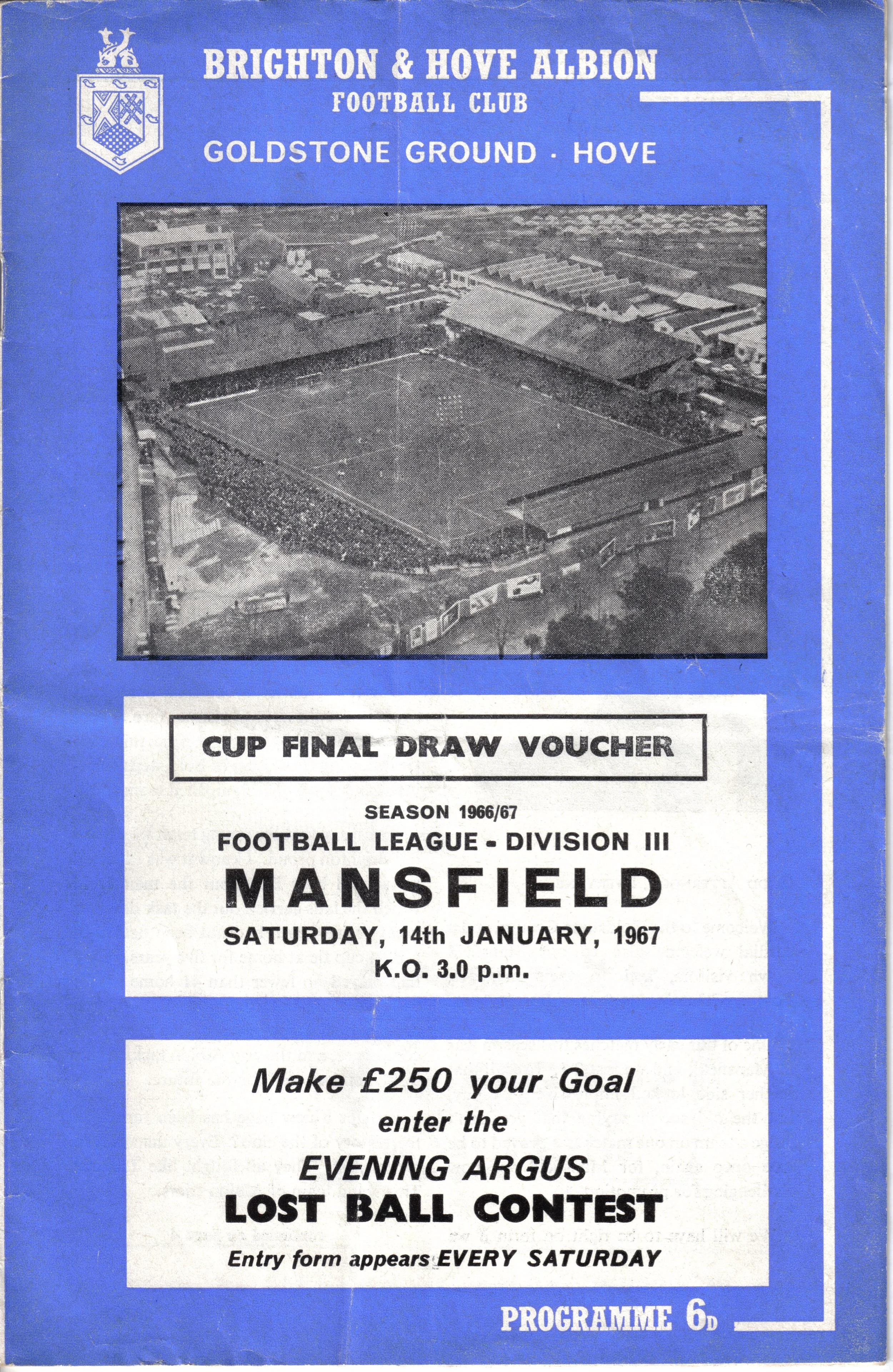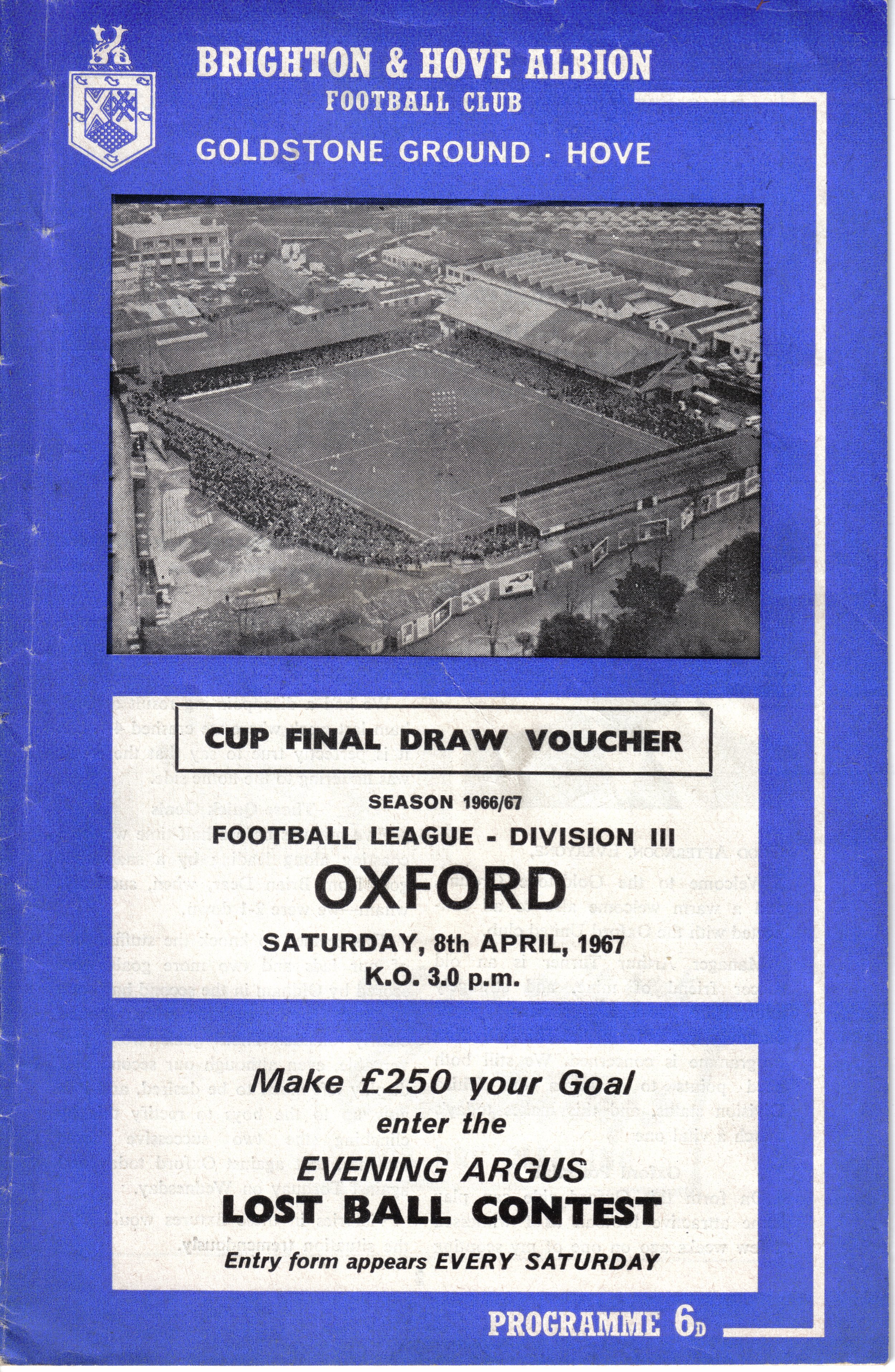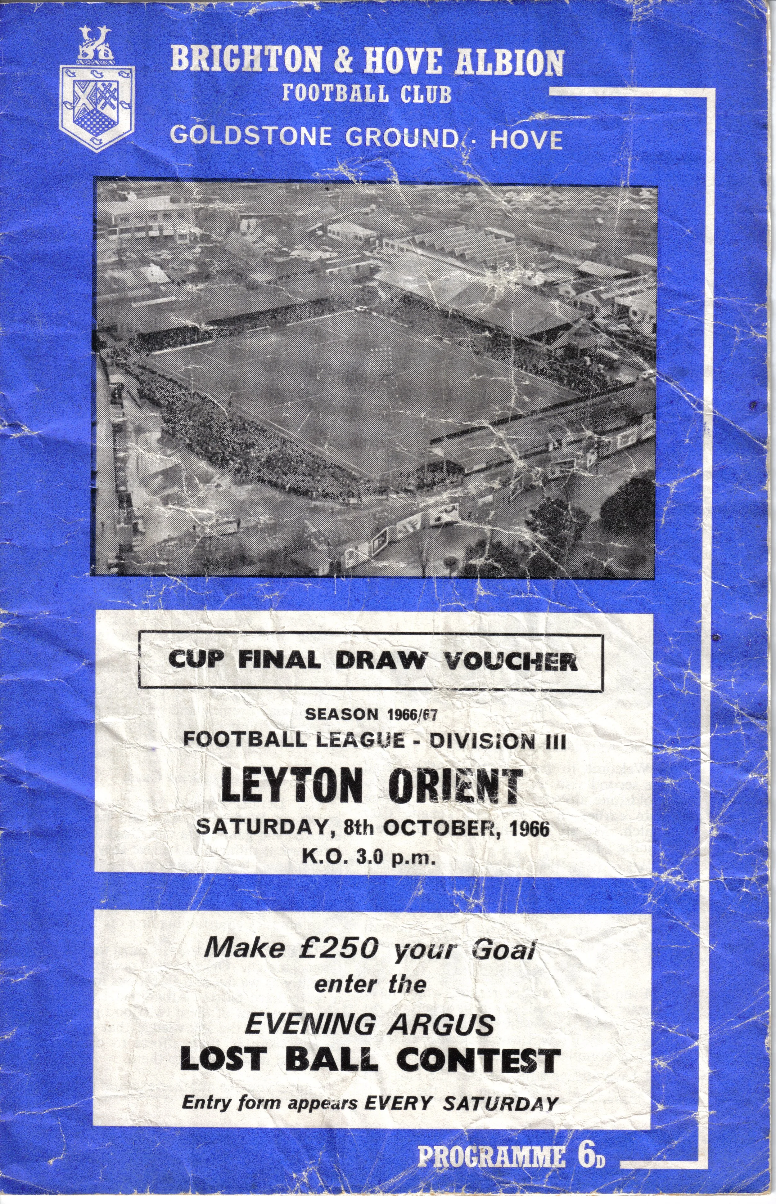 A return to a larger format for the campaign following England’s World Cup triumph. The 16-page issue contained a good mix of news, information, stats and the inevitable advertising. The mainly blue cover carried an aerial photo of the Goldstone, over the match details and an advert for the Evening Argus. As well as the 23 league programmes, Albion played three home matches in the League Cup and two in the FA Cup. The latter of those, the 4th round tie against Chelsea, saw the appearance of a couple of ‘Pirate’ programmes. These were usually very poor productions, designed purely to make money for the publishers. The attendance at the game was 35,000, so they had a captive audience! Programmes were issued for two pre-season friendlies in mid-August, against Maccabi Tel-Aviv and Sheffield United.