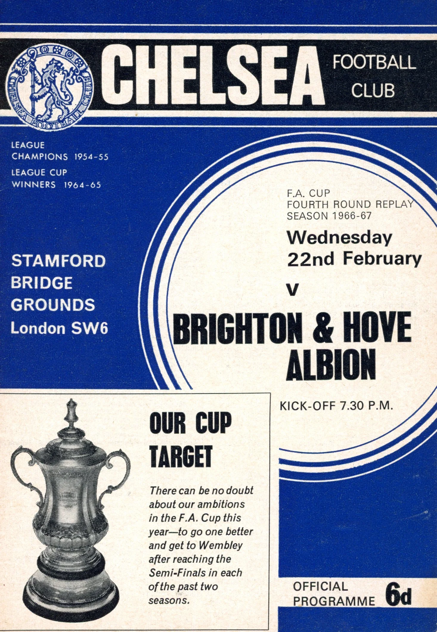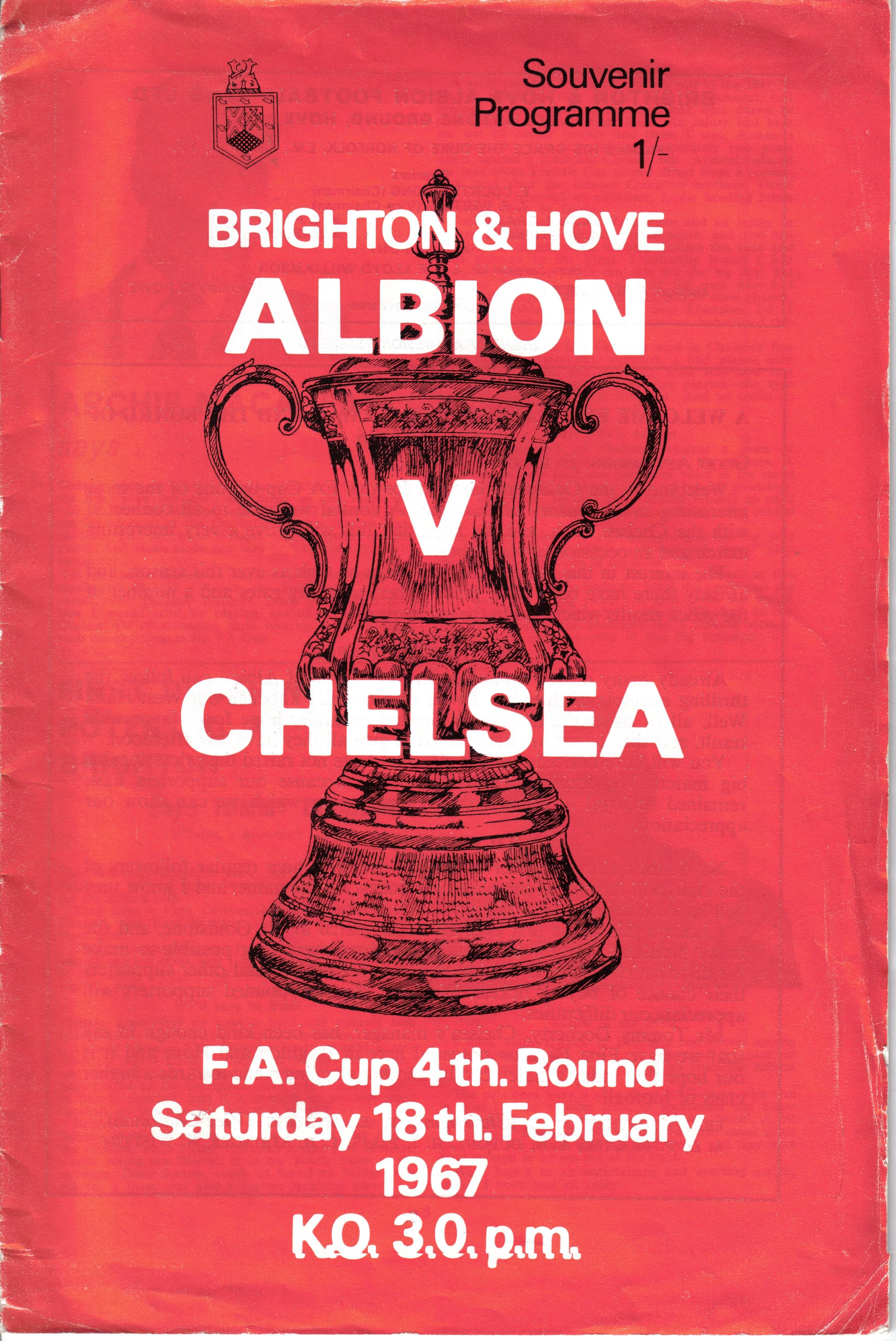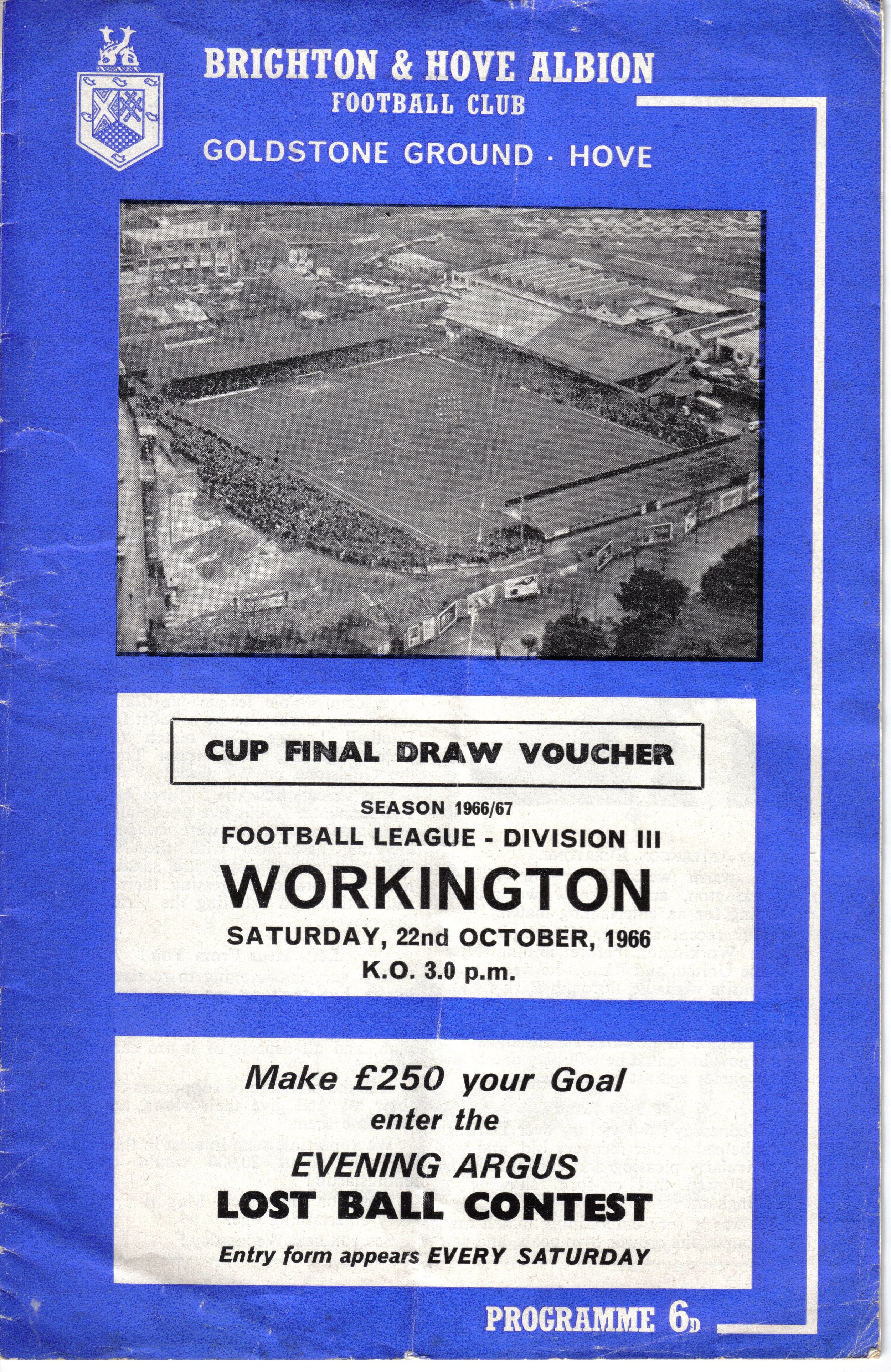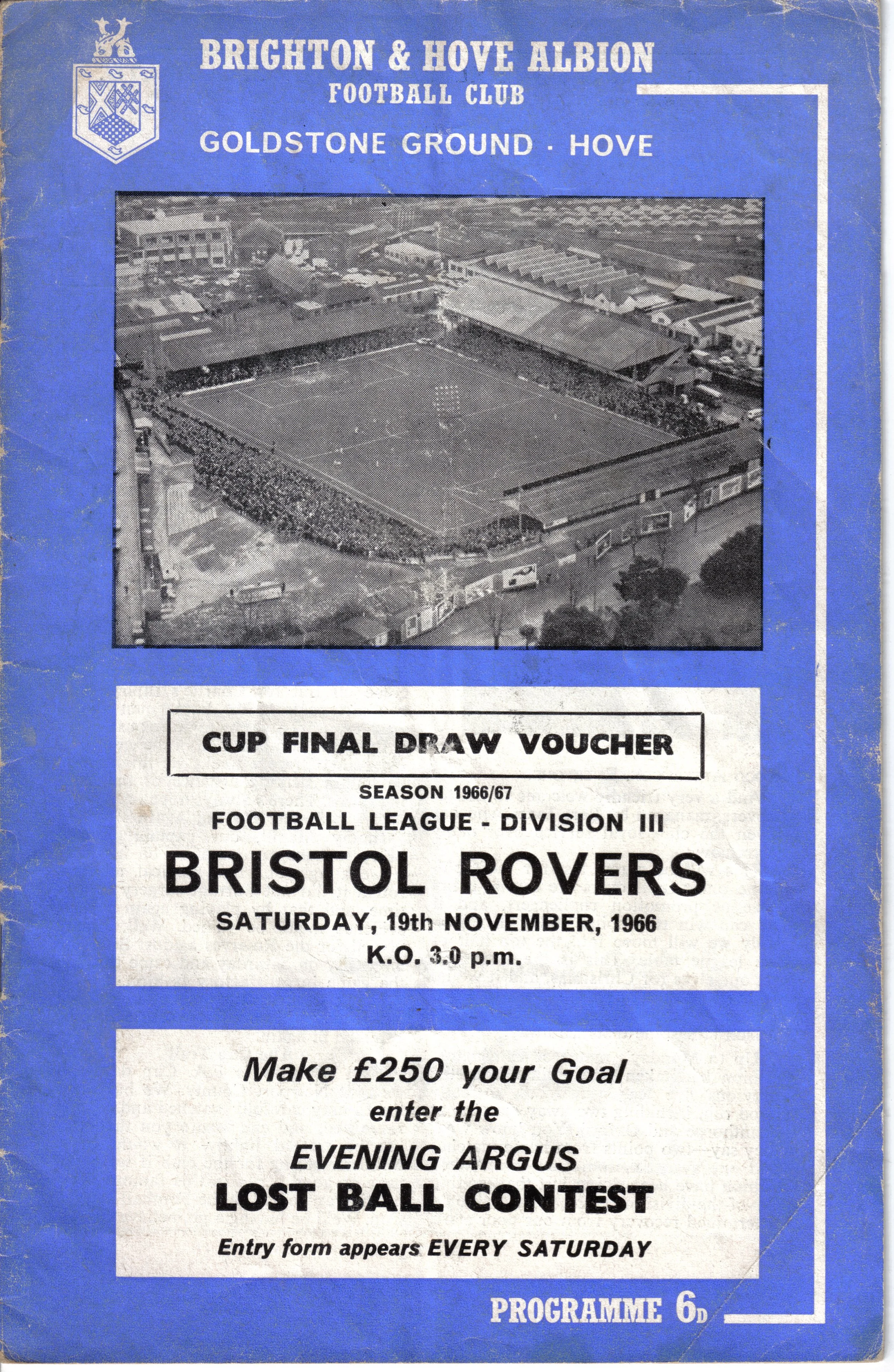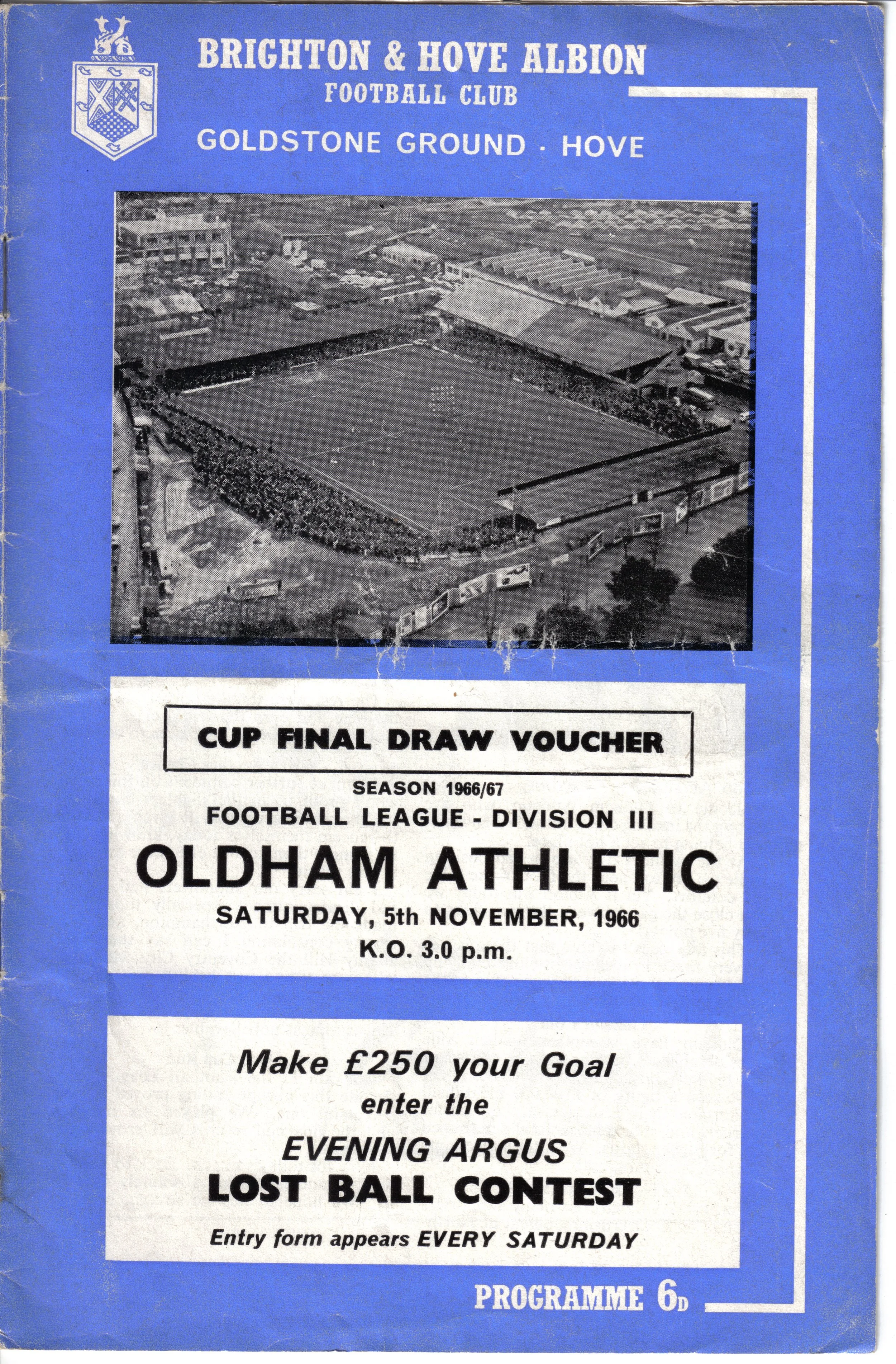 A return to a larger format for the campaign following England’s World Cup triumph. The 16-page issue contained a good mix of news, information, stats and the inevitable advertising. The mainly blue cover carried an aerial photo of the Goldstone, over the match details and an advert for the Evening Argus. As well as the 23 league programmes, Albion played three home matches in the League Cup and two in the FA Cup. The latter of those, the 4th round tie against Chelsea, saw the appearance of a couple of ‘Pirate’ programmes. These were usually very poor productions, designed purely to make money for the publishers. The attendance at the game was 35,000, so they had a captive audience! Programmes were issued for two pre-season friendlies in mid-August, against Maccabi Tel-Aviv and Sheffield United.