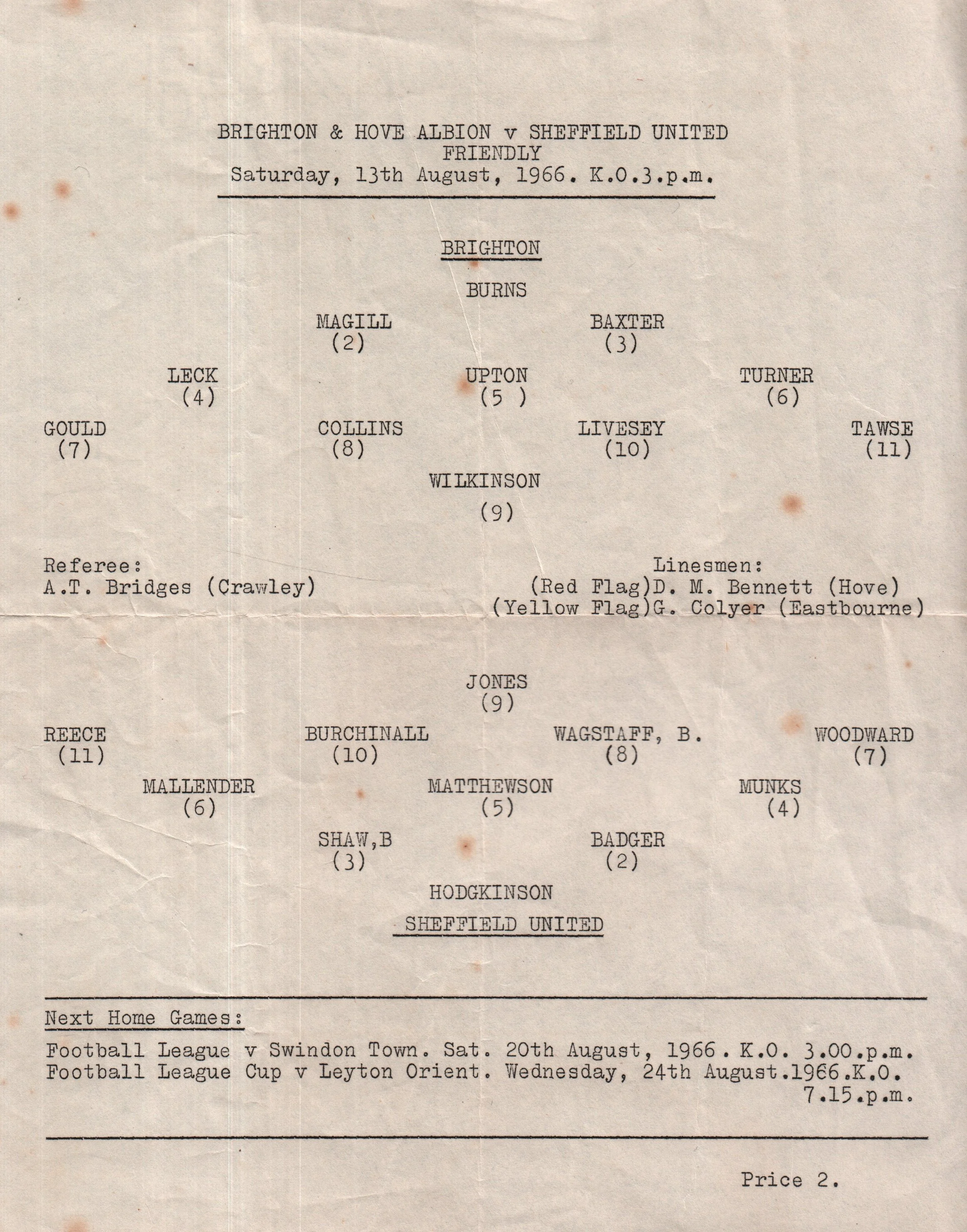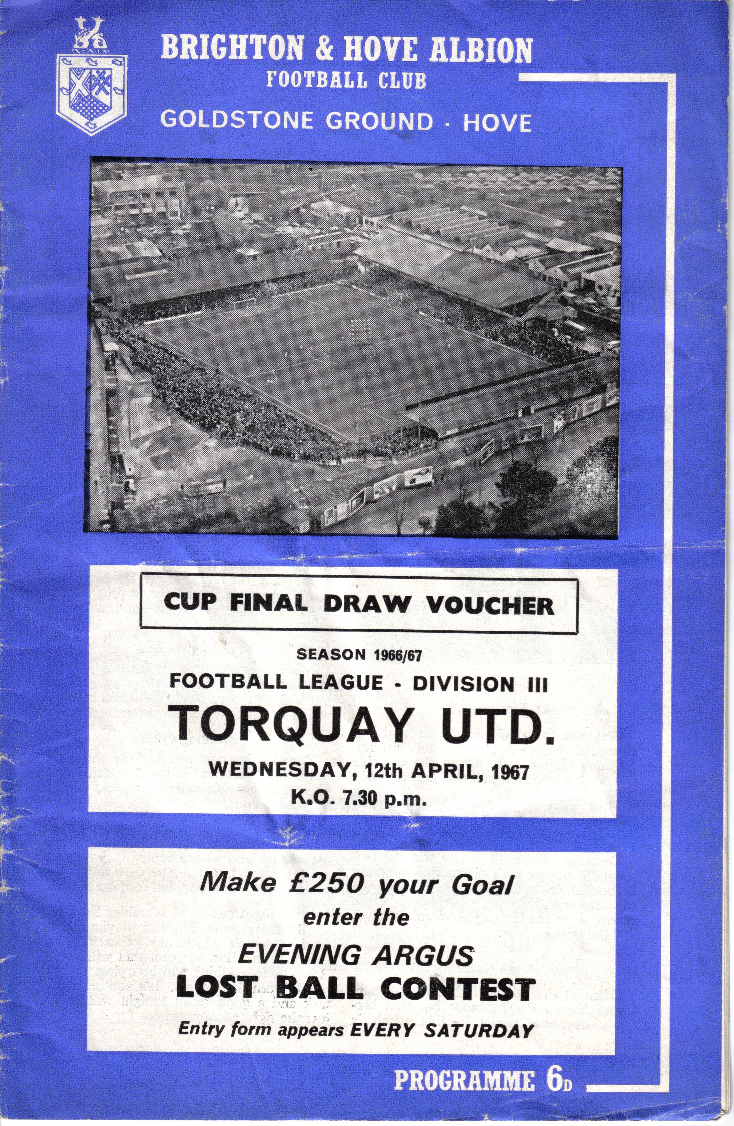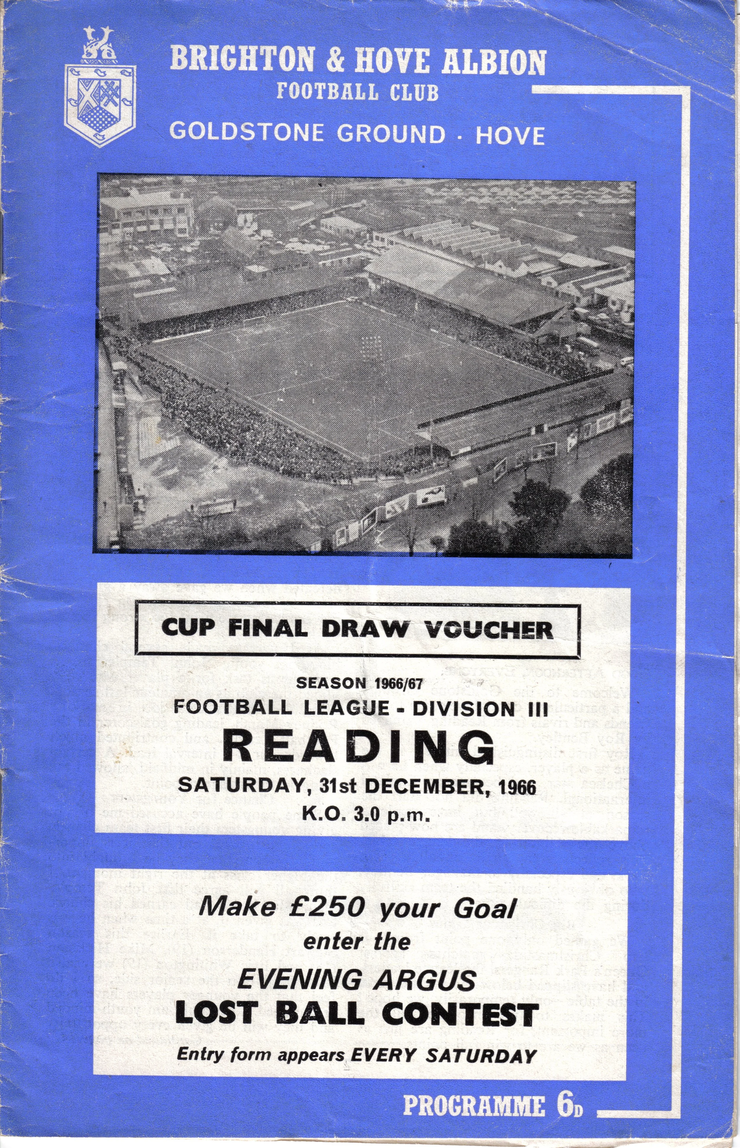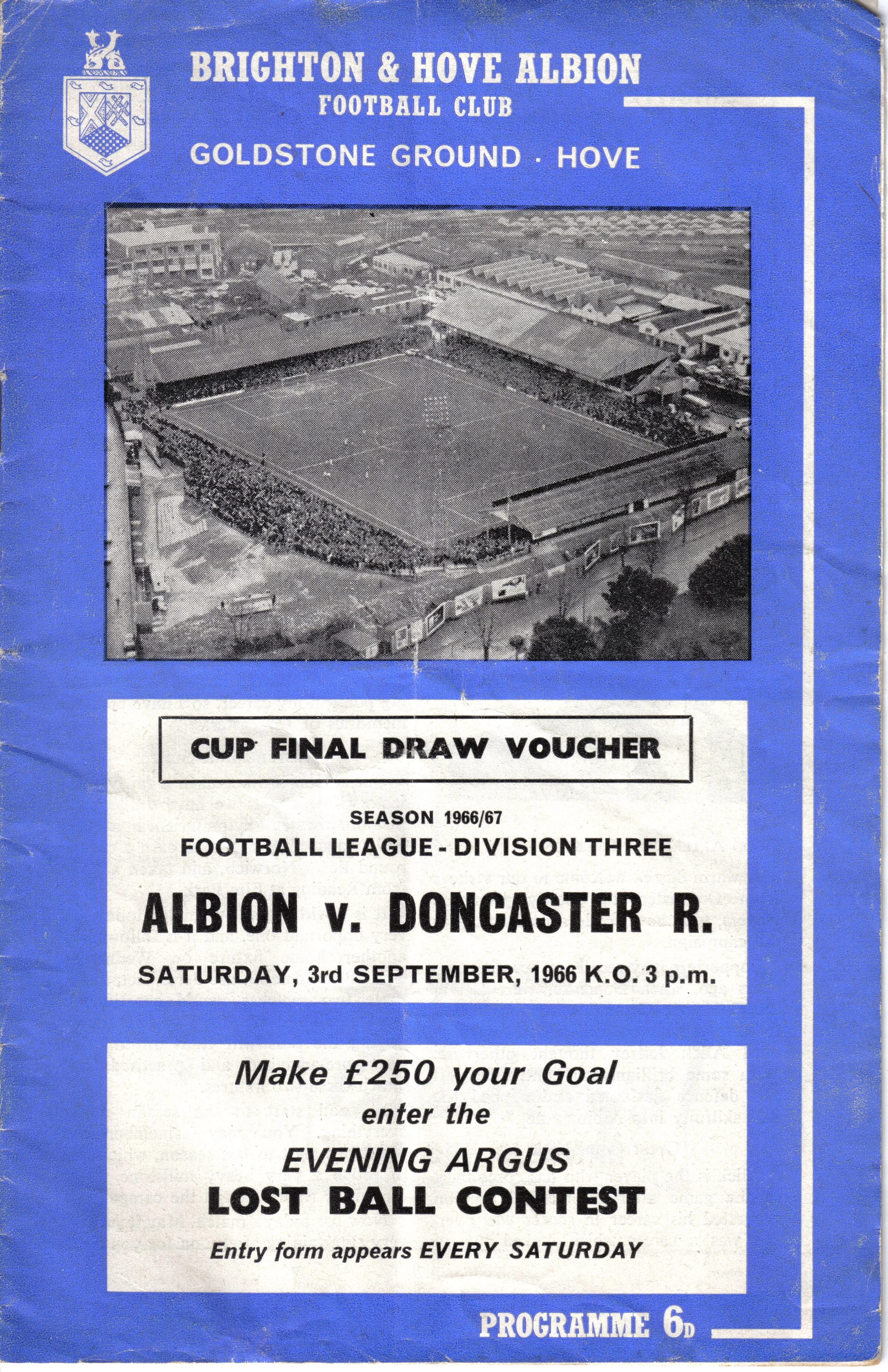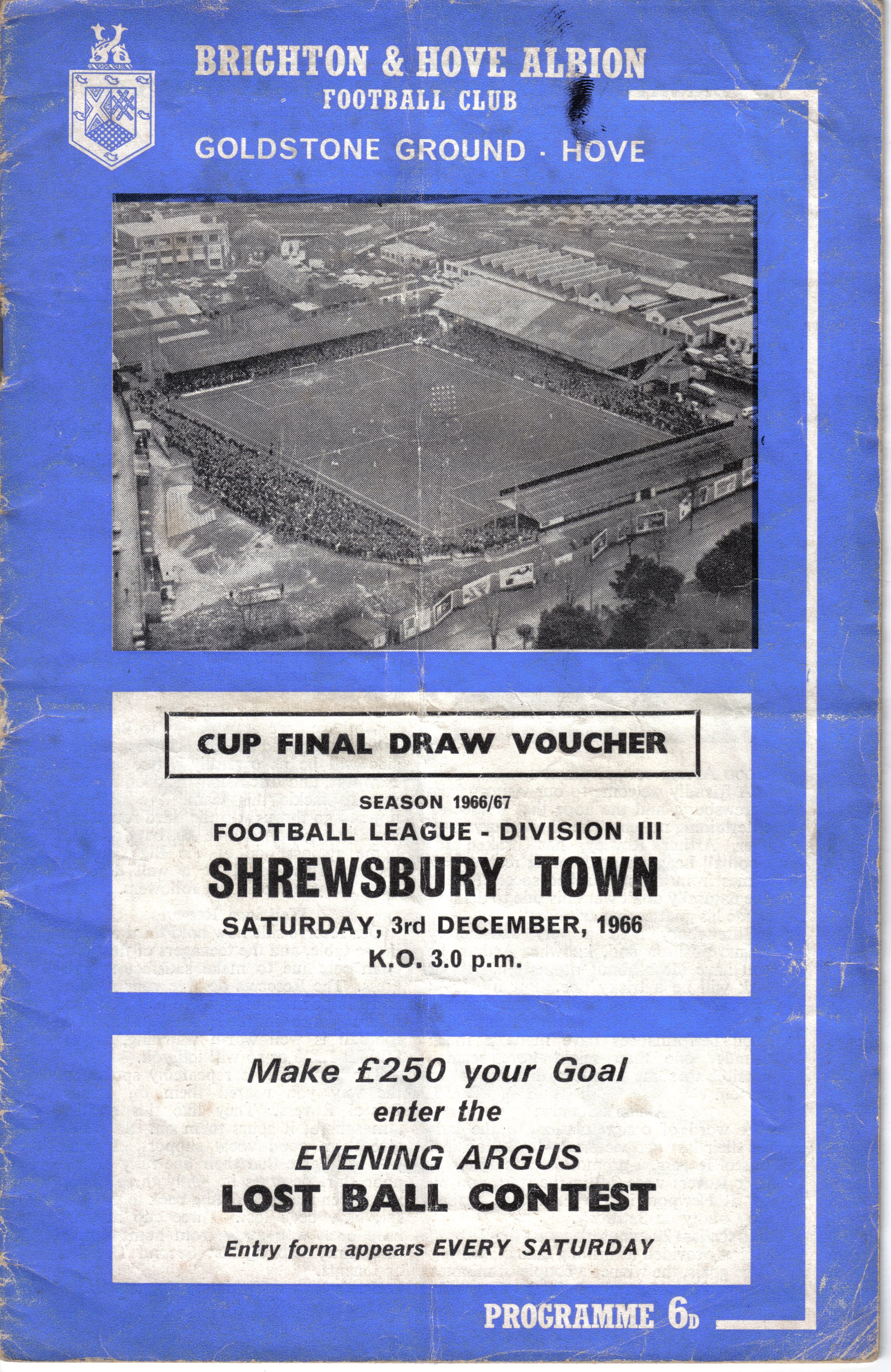A return to a larger format for the campaign following England’s World Cup triumph. The 16-page issue contained a good mix of news, information, stats and the inevitable advertising. The mainly blue cover carried an aerial photo of the Goldstone, over the match details and an advert for the Evening Argus. As well as the 23 league programmes, Albion played three home matches in the League Cup and two in the FA Cup. The latter of those, the 4th round tie against Chelsea, saw the appearance of a couple of ‘Pirate’ programmes. These were usually very poor productions, designed purely to make money for the publishers. The attendance at the game was 35,000, so they had a captive audience! Programmes were issued for two pre-season friendlies in mid-August, against Maccabi Tel-Aviv and Sheffield United.